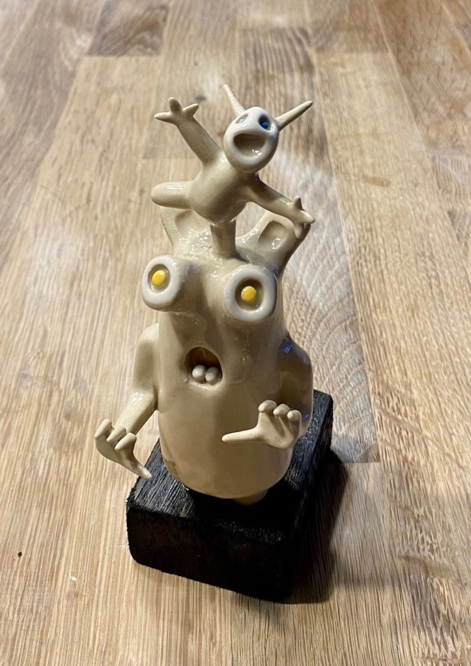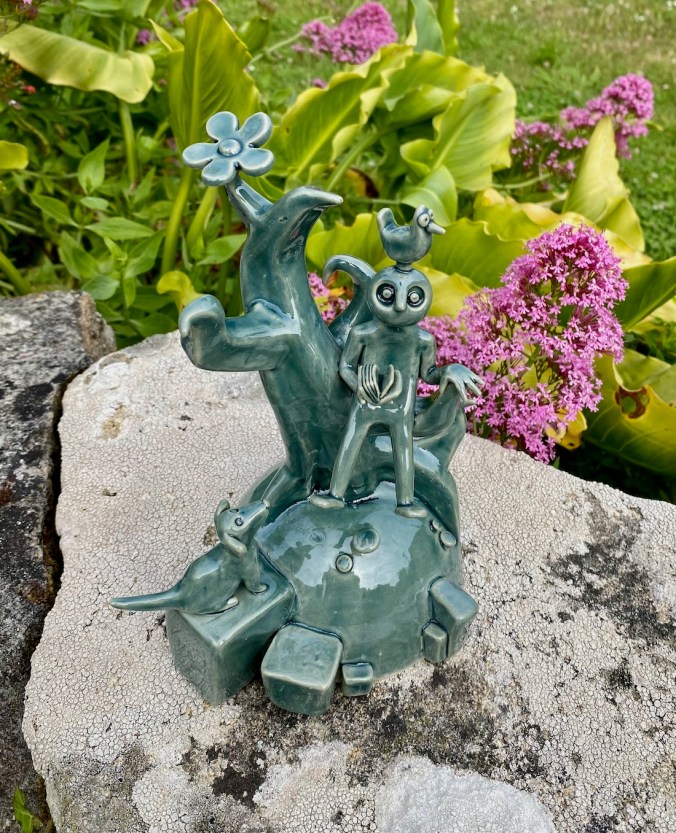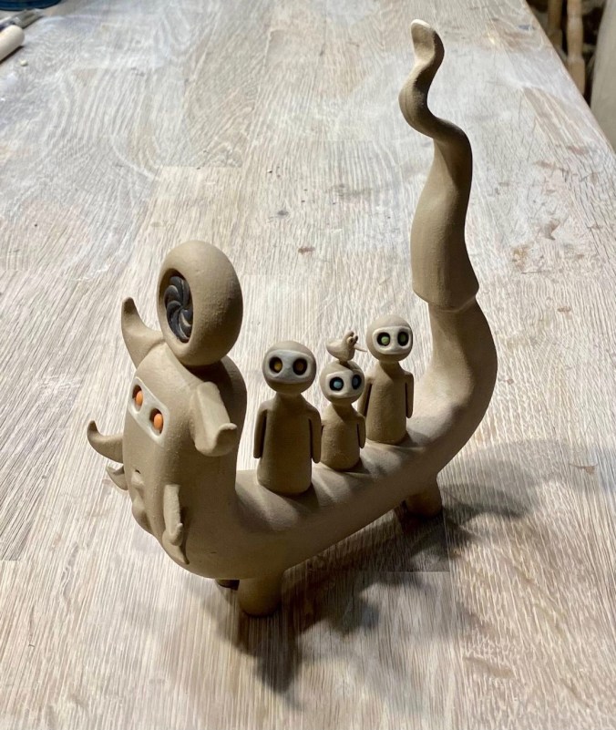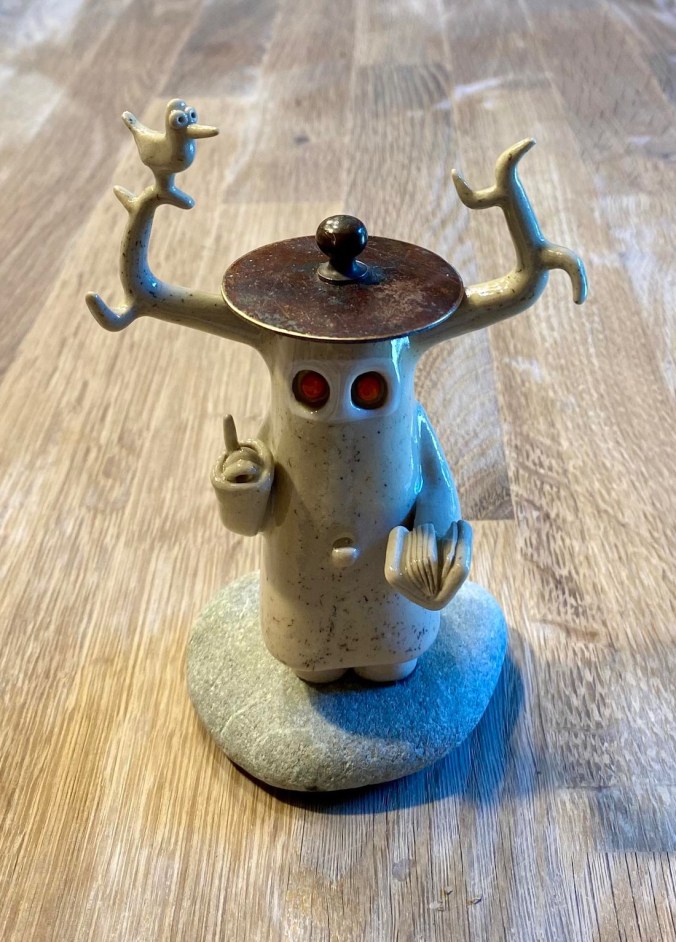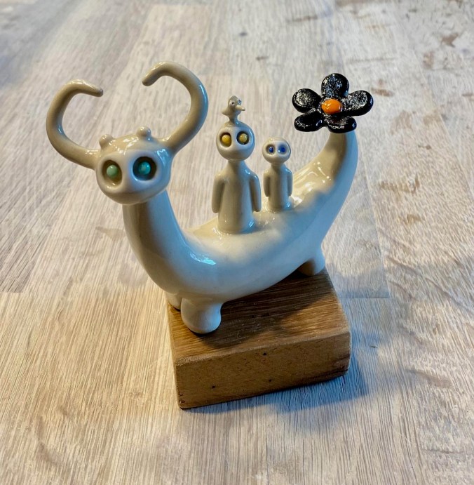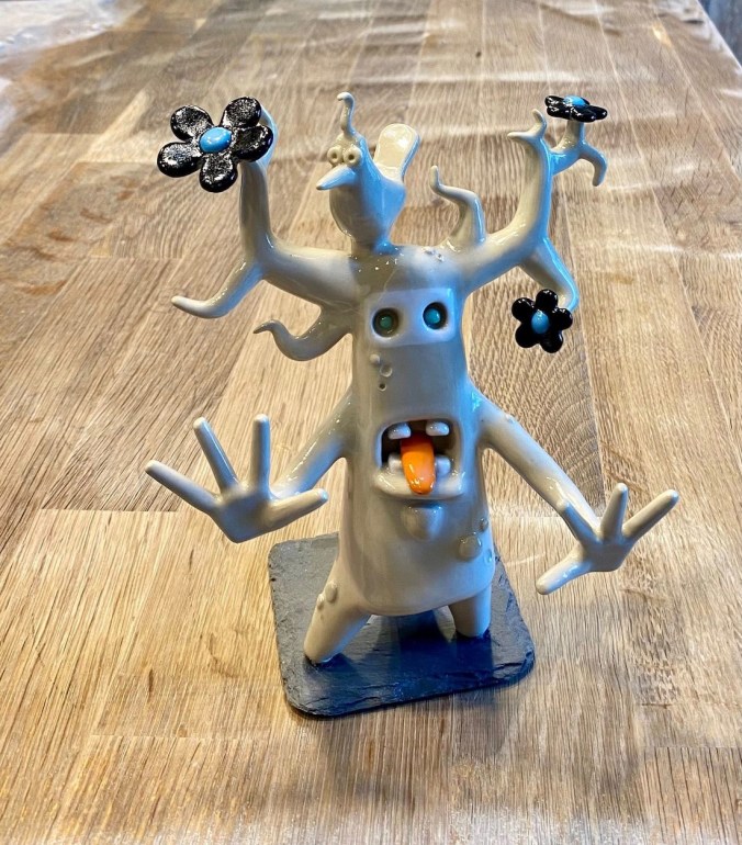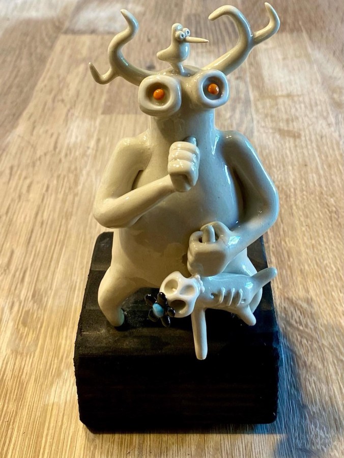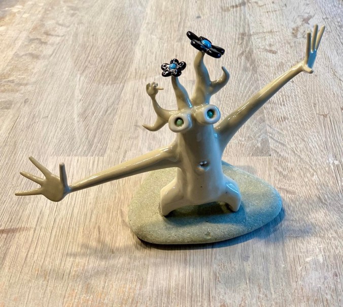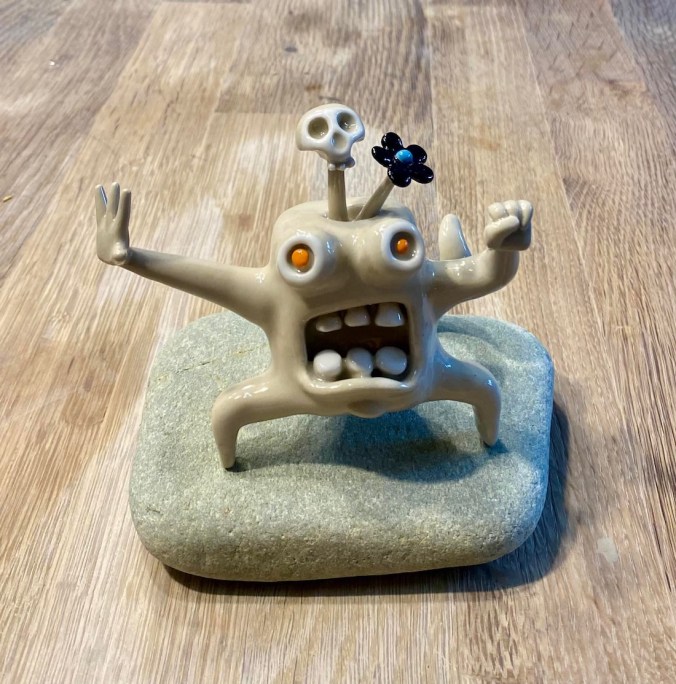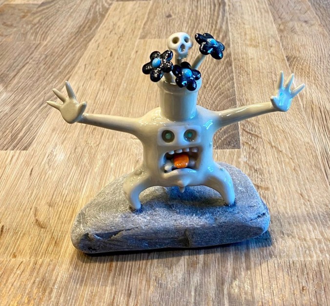 Ensuite les créations de 2022, avec pour nouveautés : l’utilisation du Vert Mousse, du Noir Ardoise, du Sable, quelques essais en porcelaine, des bijoux, des totems de têtes et des assemblées de bonzommes sur galet !