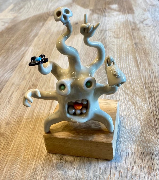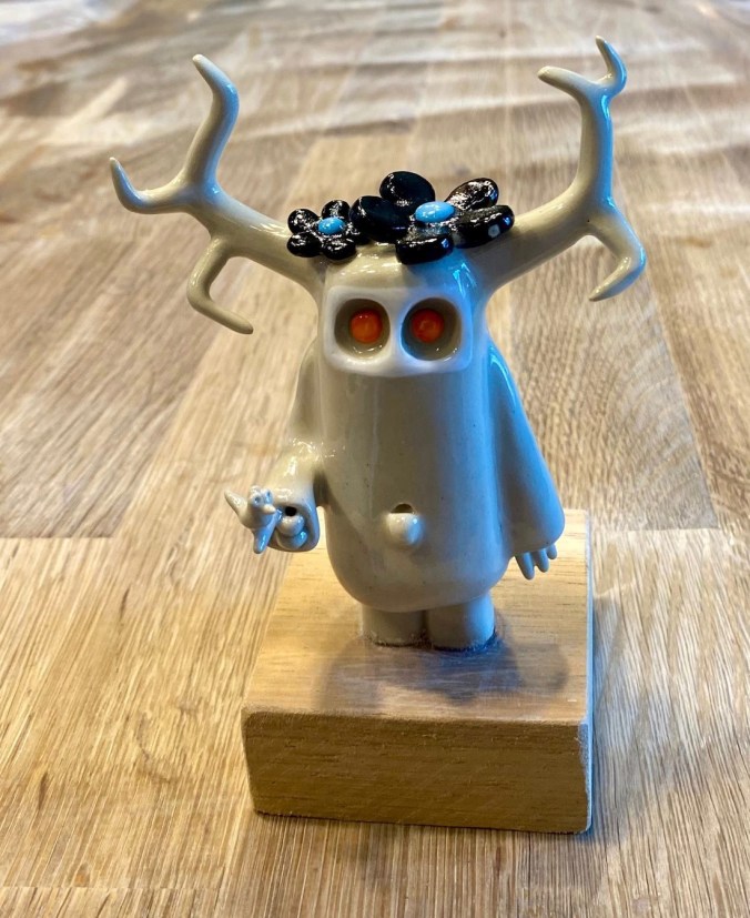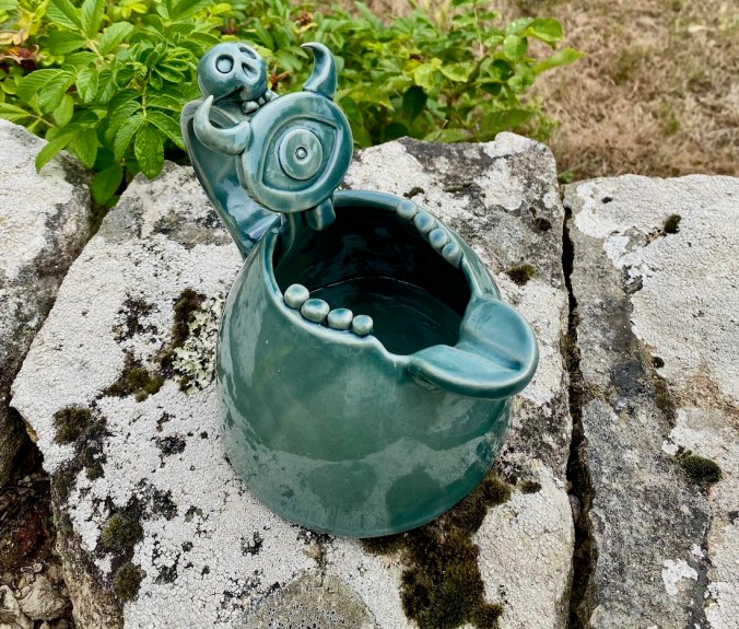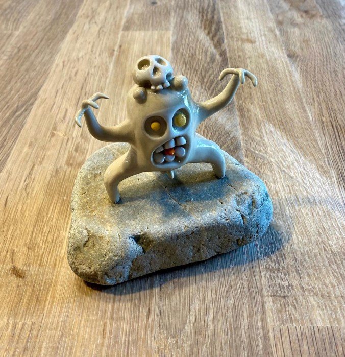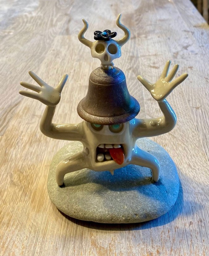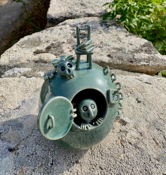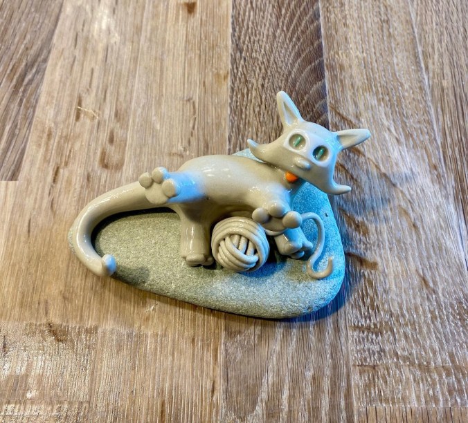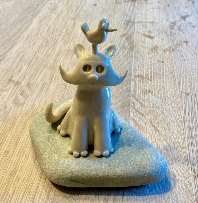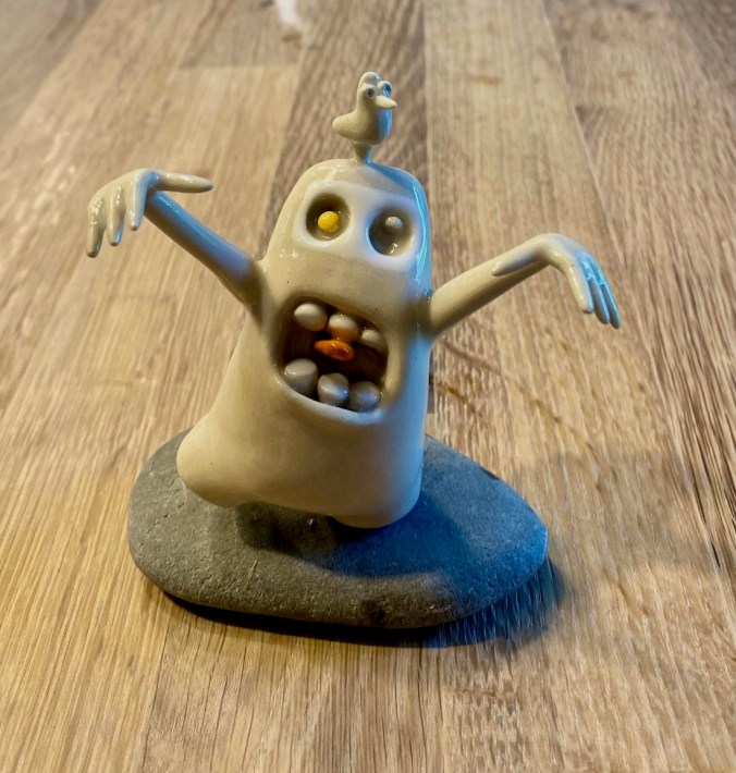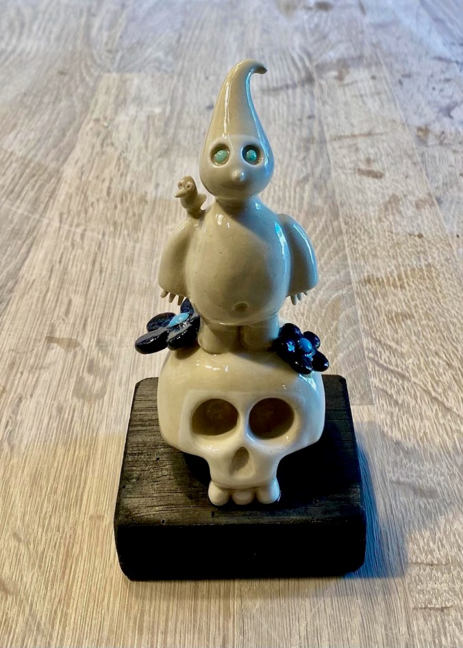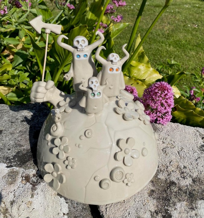 Ensuite les créations de 2022, avec pour nouveautés : l’utilisation du Vert Mousse, du Noir Ardoise, du Sable, quelques essais en porcelaine, des bijoux, des totems de têtes et des assemblées de bonzommes sur galet !