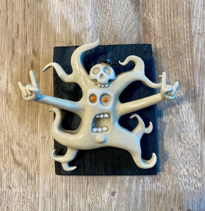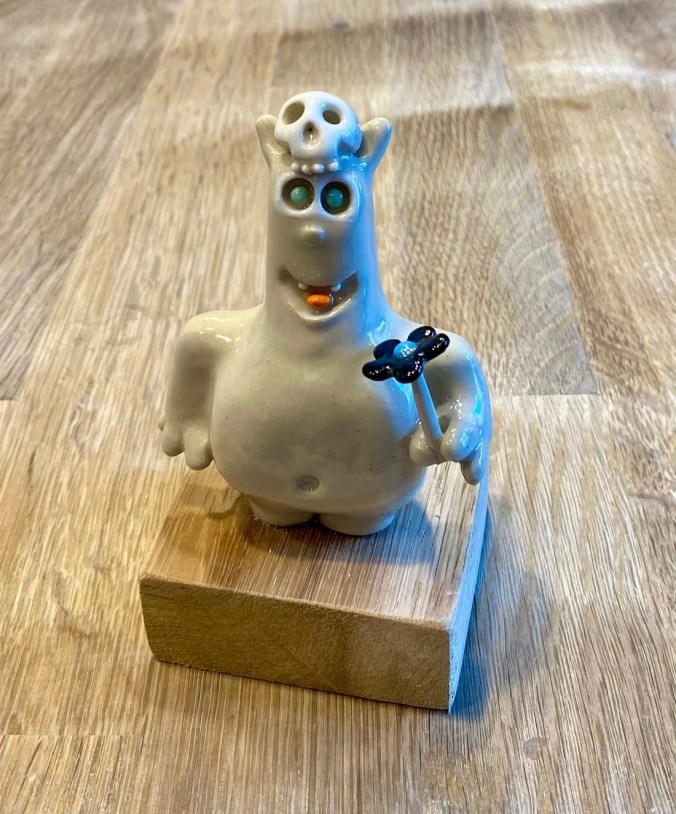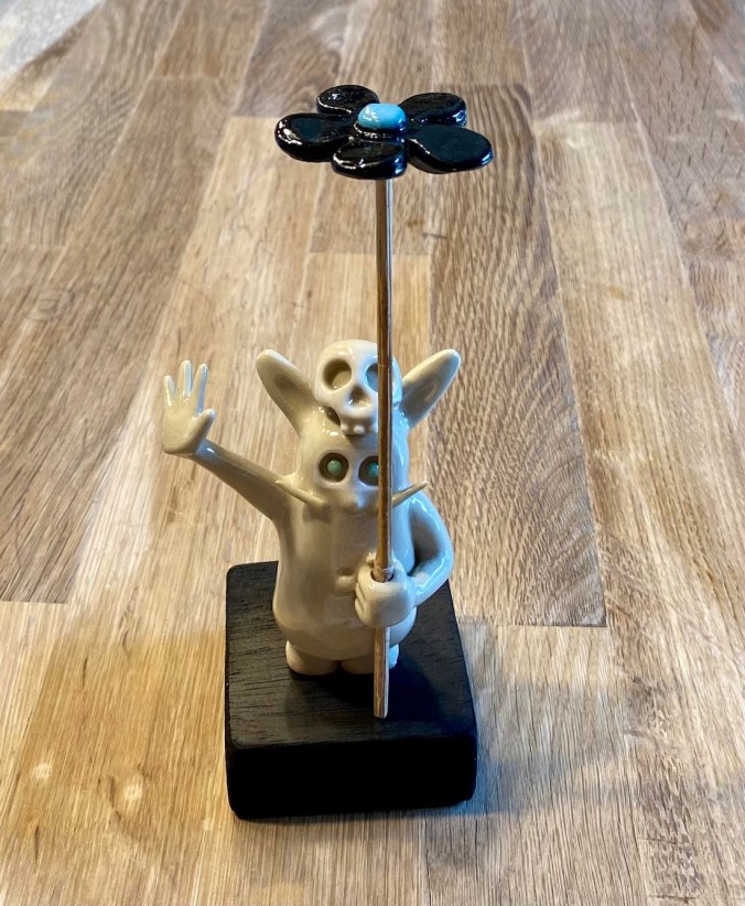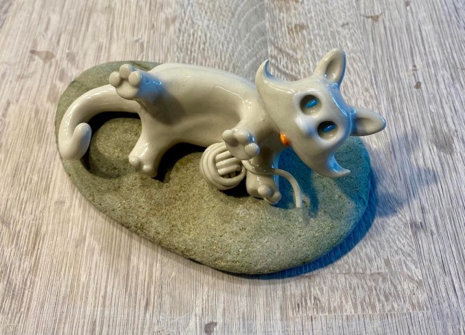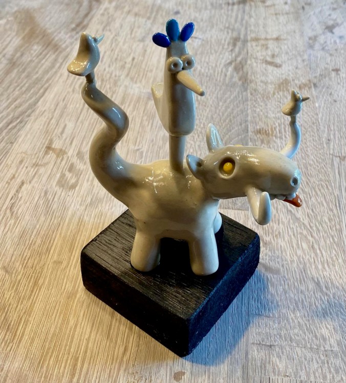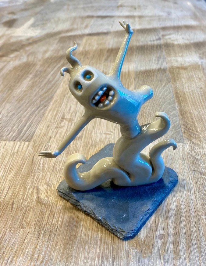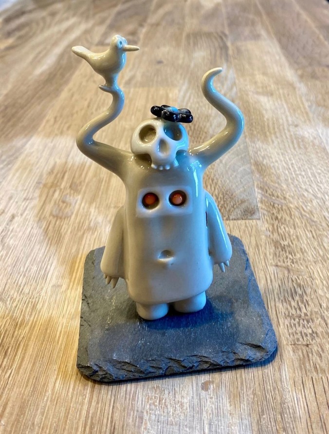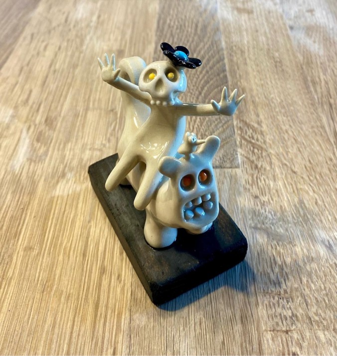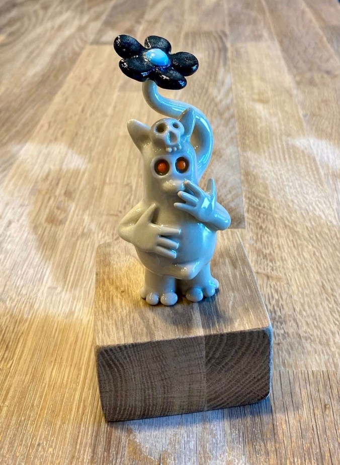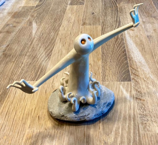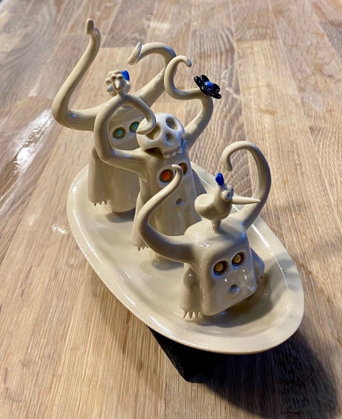 Ensuite les créations de 2022, avec pour nouveautés : l’utilisation du Vert Mousse, du Noir Ardoise, du Sable, quelques essais en porcelaine, des bijoux, des totems de têtes et des assemblées de bonzommes sur galet !