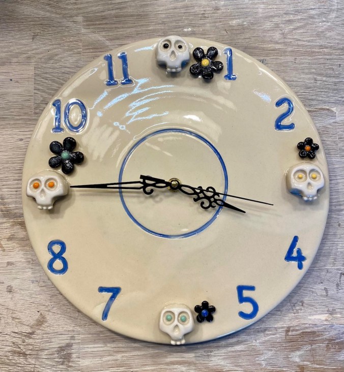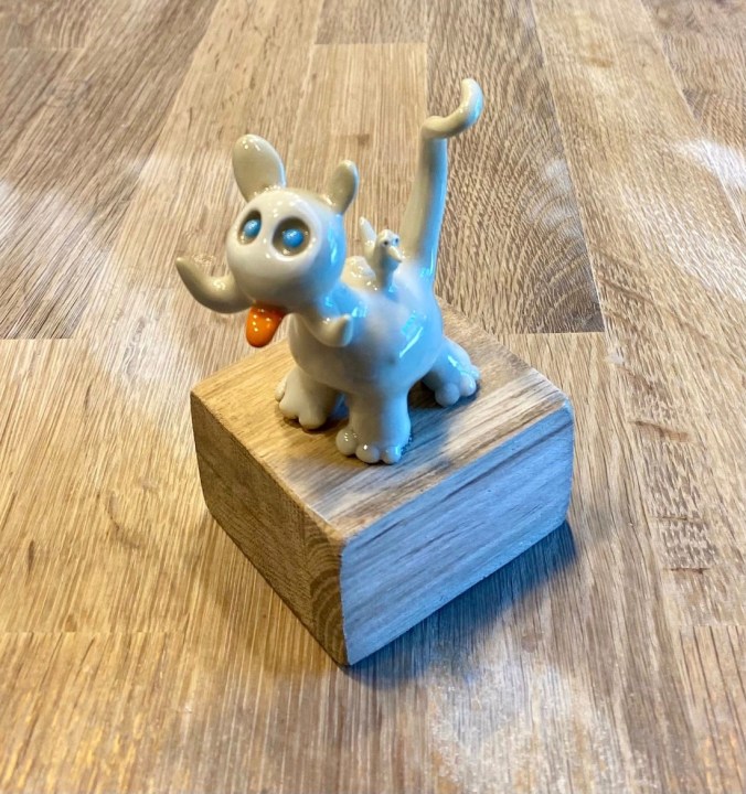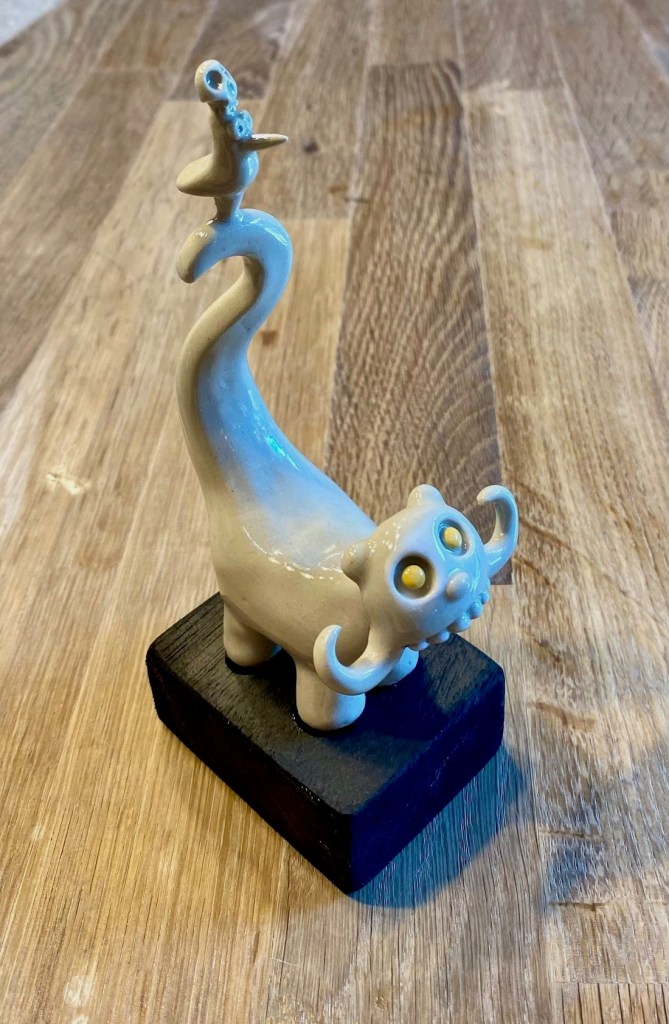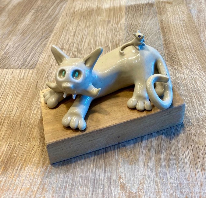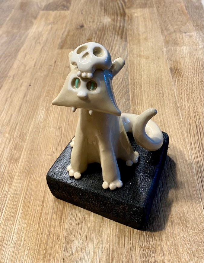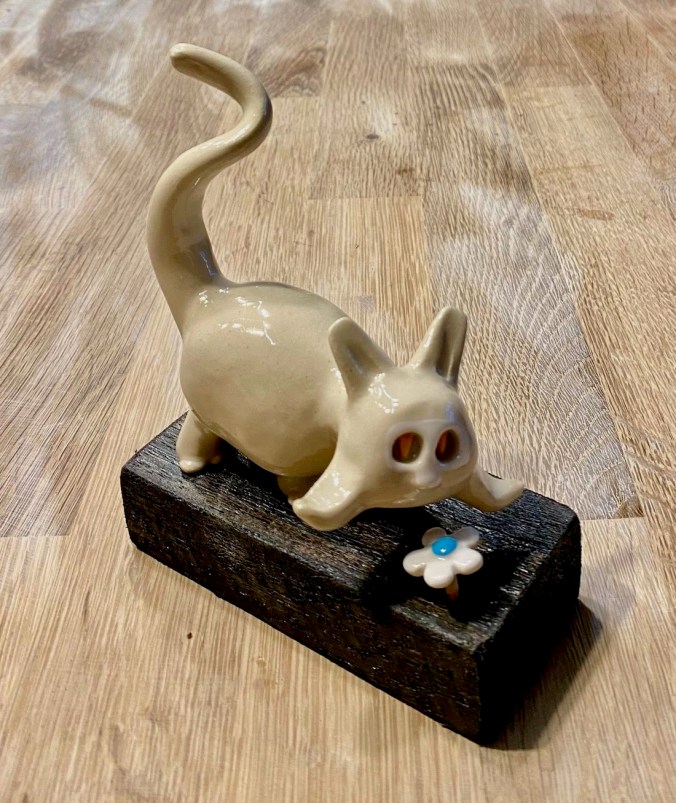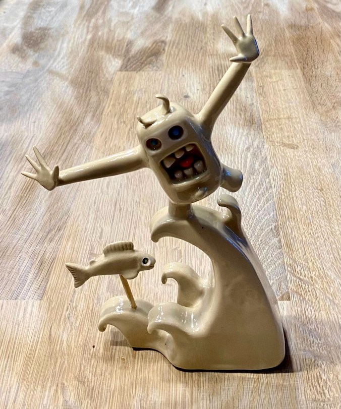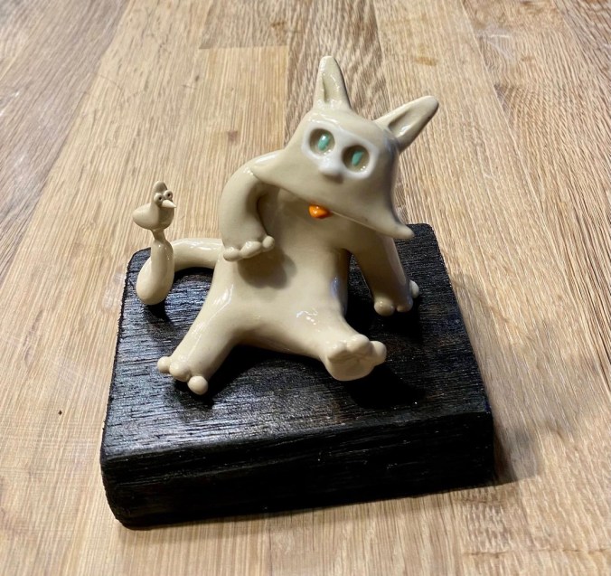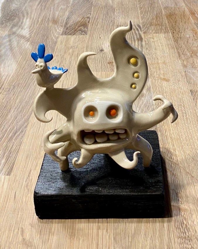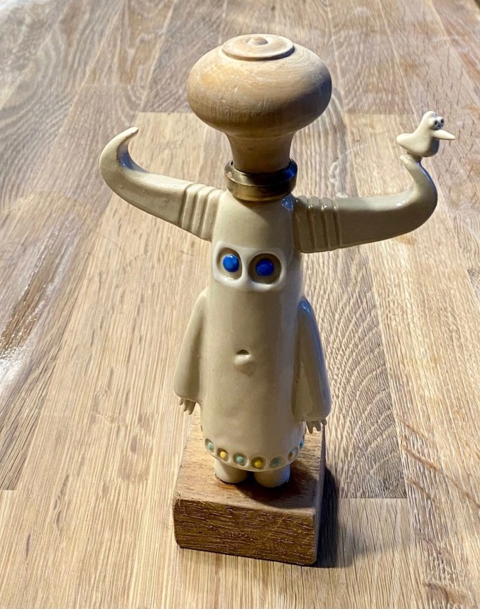 Ensuite les créations de 2022, avec pour nouveautés : l’utilisation du Vert Mousse, du Noir Ardoise, du Sable, quelques essais en porcelaine, des bijoux, des totems de têtes et des assemblées de bonzommes sur galet !