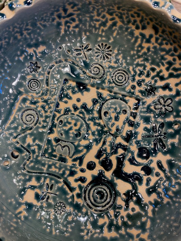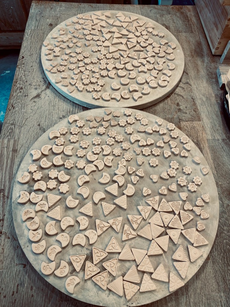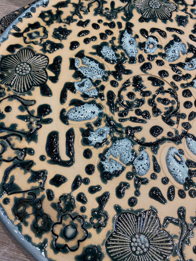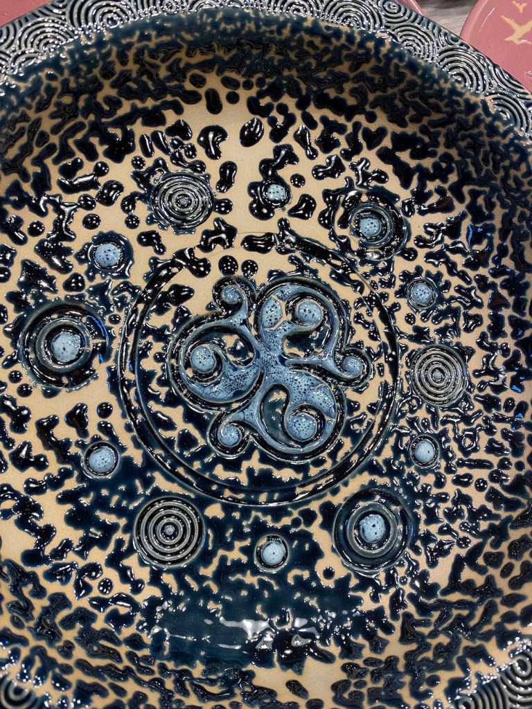 NON, ce n’est pas joli, parce que ce travail que nous souhaitons soigné est devenu totalement illisible. Pourquoi pas sur des pièces sans motif…mais là, ce n’est pas le cas, donc poubelle la semaine de travail ! (à deux) Ça tombe bien avant les marchés de Noël. On se remet au travail pour tenter de livrer les commandes (et oui, il y en a parmi cette cuisson) à temps…
