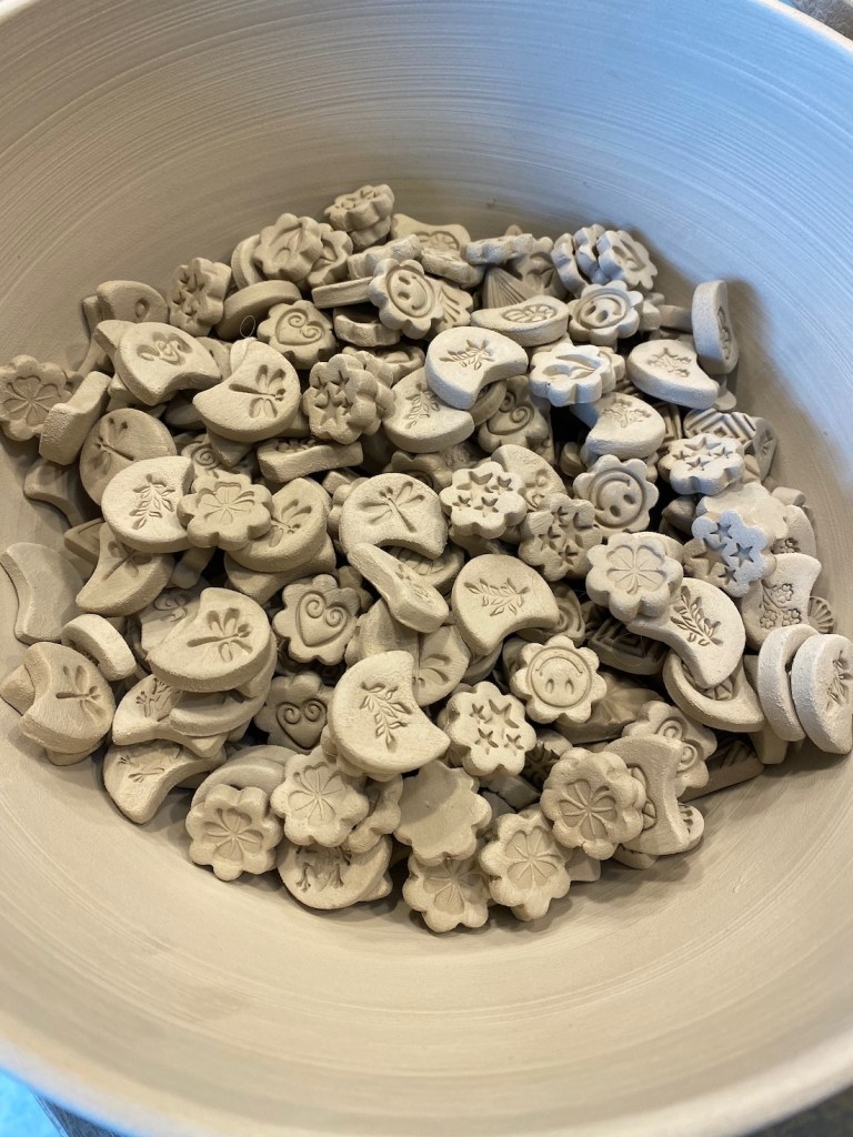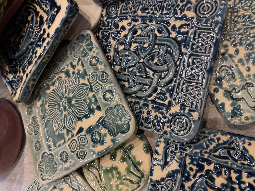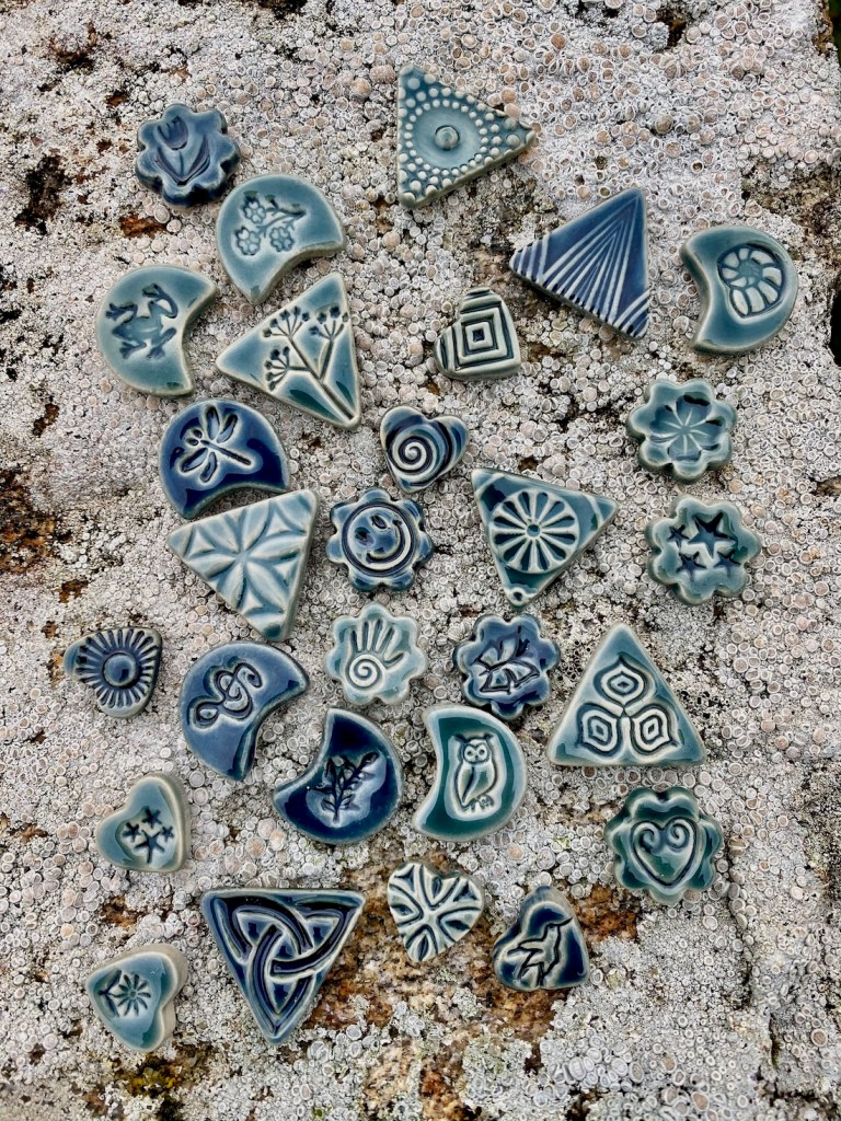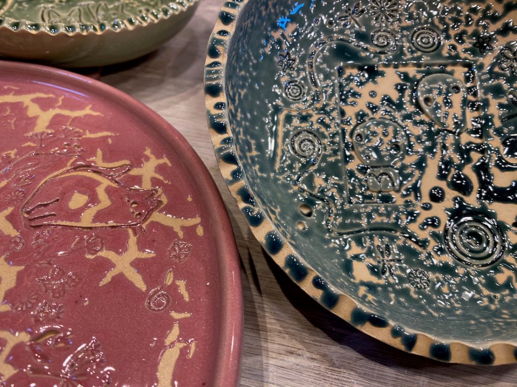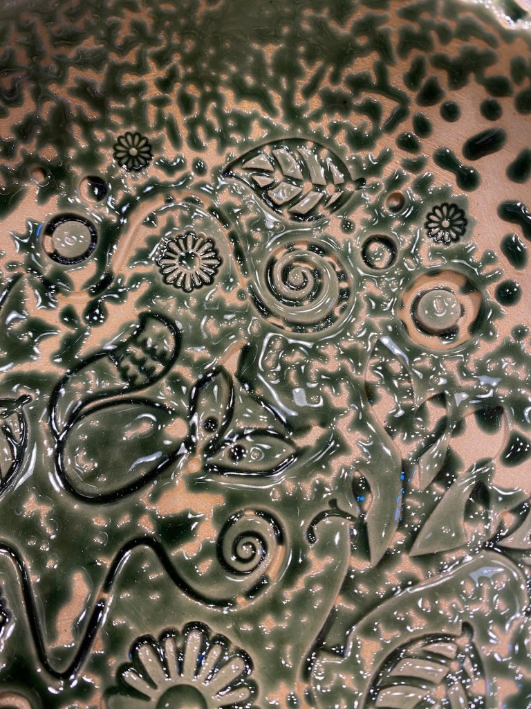 NON, ce n’est pas joli, parce que ce travail que nous souhaitons soigné est devenu totalement illisible. Pourquoi pas sur des pièces sans motif…mais là, ce n’est pas le cas, donc poubelle la semaine de travail ! (à deux) Ça tombe bien avant les marchés de Noël. On se remet au travail pour tenter de livrer les commandes (et oui, il y en a parmi cette cuisson) à temps…