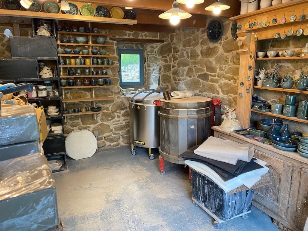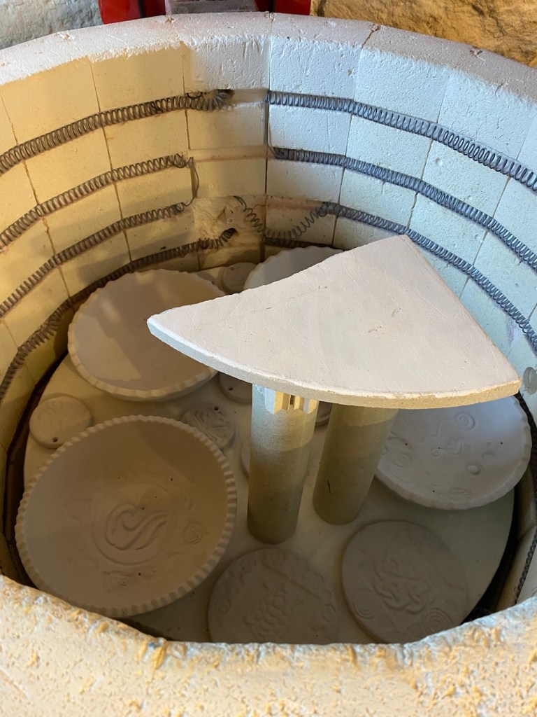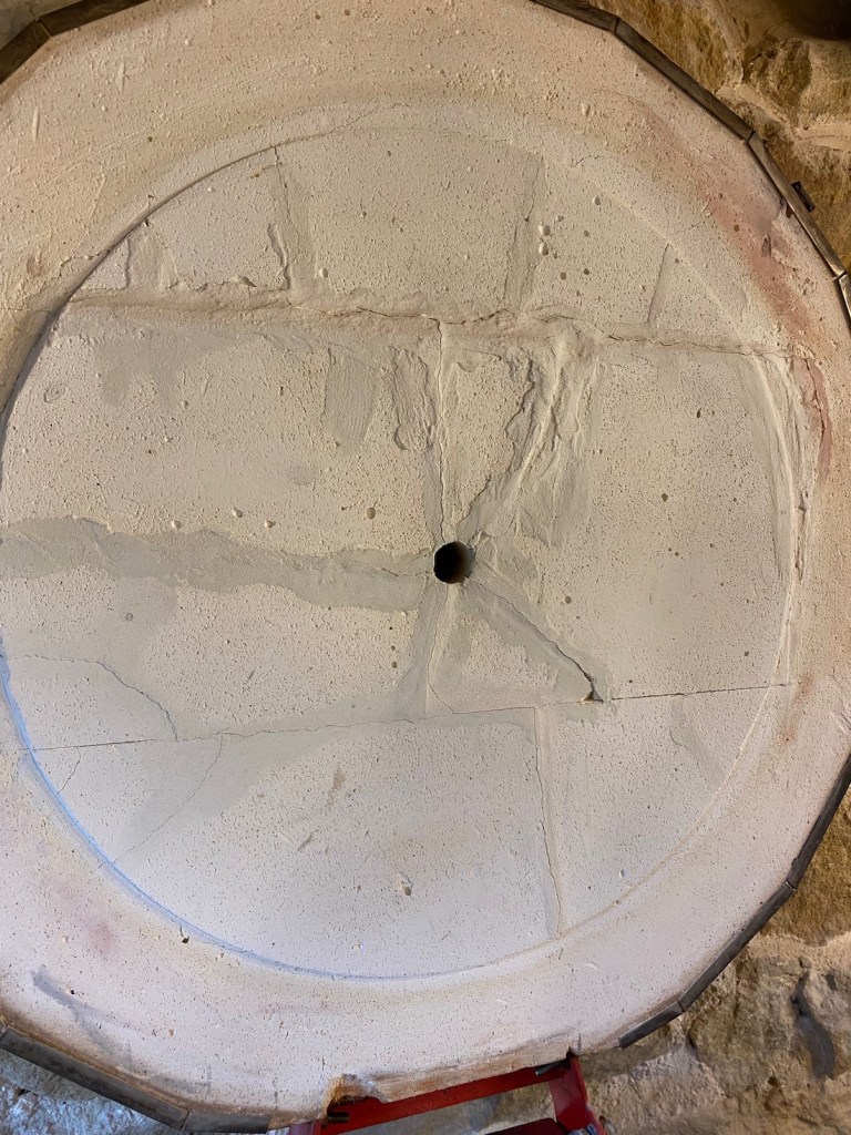 Voilà ce qui nous a occupés et préoccupés quasiment toute l’année 2025. Depuis un moment, notre four de Como Céramique défaille. Il s’avère être un bon four pour amateur éclairé mais nous, nous l’avons surexploité depuis 9 ans, lui imposant en moyenne deux cuissons par semaine et un changement de résistances chaque année pour tenir le rythme. Résultat : toutes ses briques réfractaires, du couvercle et des parois s’effritent et se fissurent, au point de venir parfois se coller à l’émail nos pièces, les rendant invendables. Gildas parvient à recoller les fissures du couvercle et nous protégeons tant bien que mal les pièces d’un effondrement potentiel…au mieux, de miettes. Mais le four patine à monter en température…il est en fin de vie, il va nous lâcher, on ne peut pas se le permette…la saison approche…