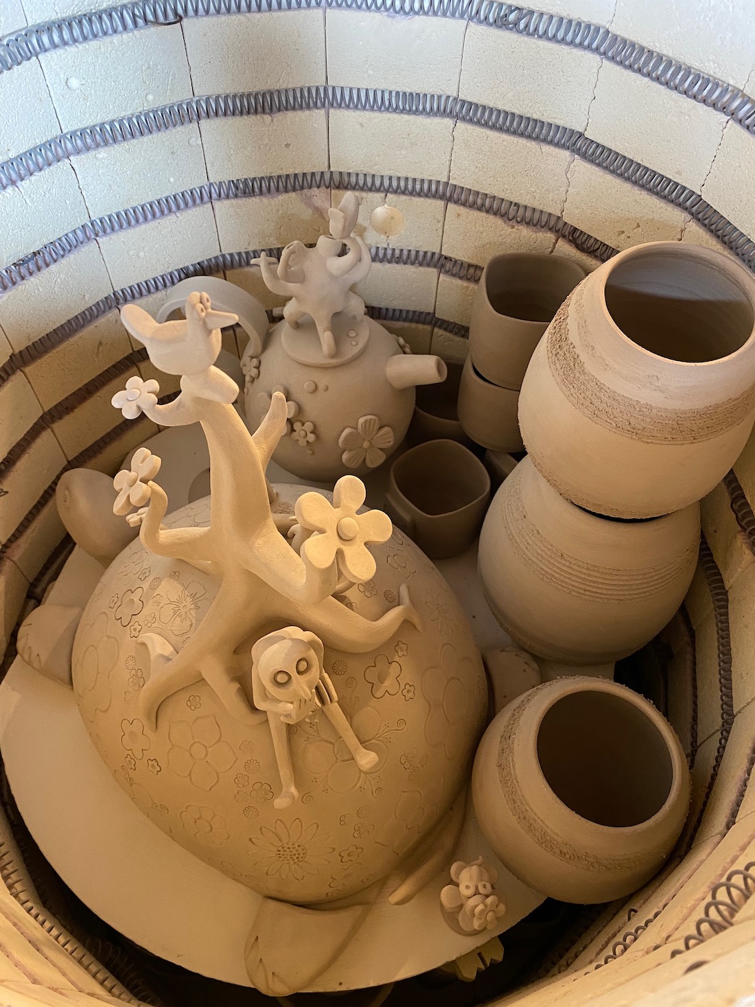 Elle a arrêté net la courbe de cuisson d’un grès vers 900 degrés, interdisant ainsi tout rattrapage possible par une re cuisson. L’émail a en effet atteint un stade de fusion avant refroidissement (panne) qui l’empêche dorénavant d’adhérer à la terre. C’est foutu. On recuit quand même le contenu dans notre vieux four, en attendant la réparation, parce qu’on est têtus et qu’il contient aussi malheureusement des pièces d’élèves…qu’il faudra bien rendre. Voici les nôtres :
