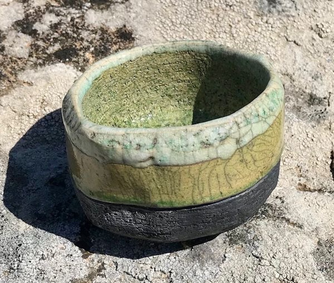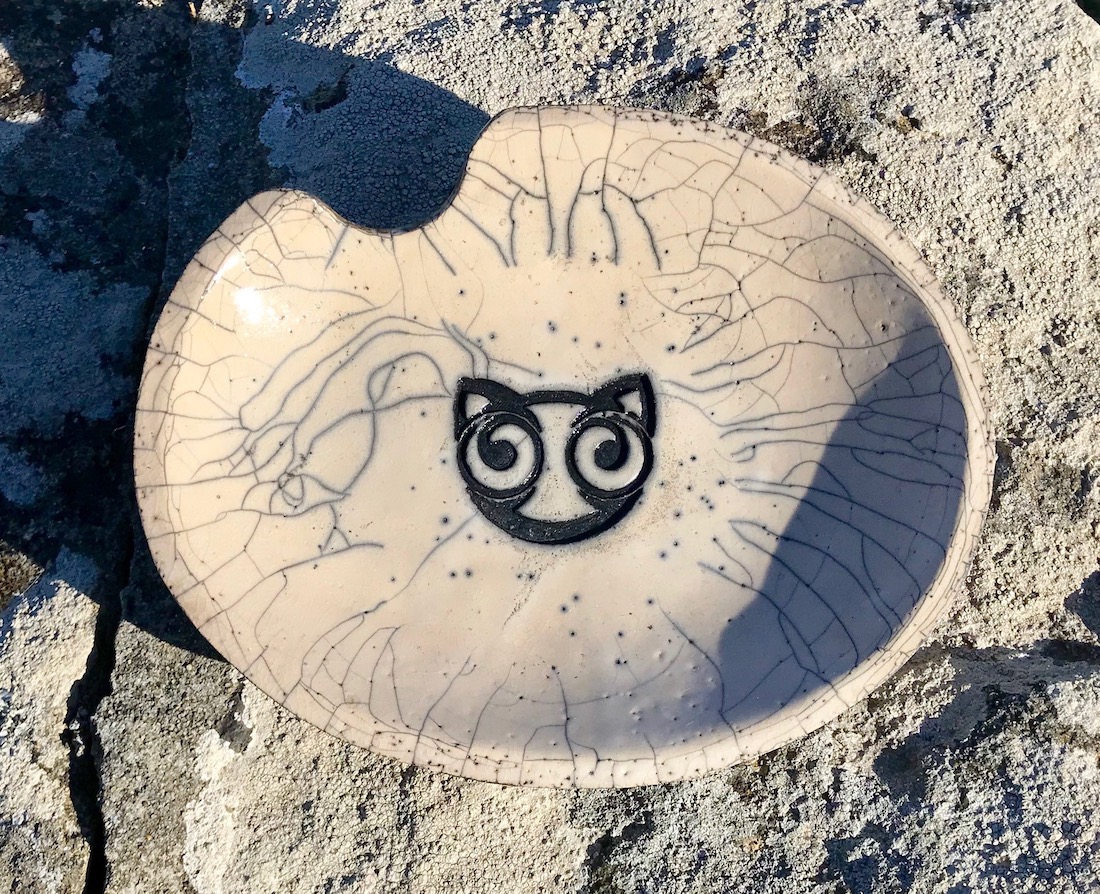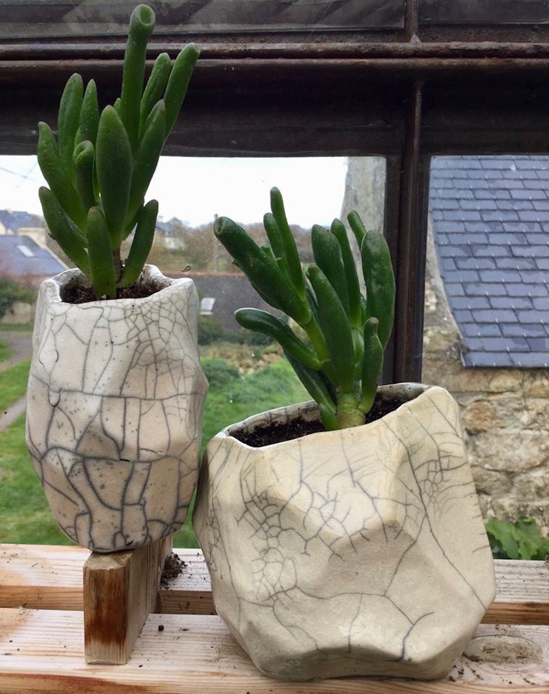 Le raku est une technique cherchant à provoquer des craquelures sombres dans l’émail. Je ne vais pas ici vous faire un cours sur ce savoir-faire ! Il y a déjà toutes les informations utiles sur le net ! Sachez cependant qu’il est interdit de créer des pots en raku pour un usage alimentaire. Vous saurez bientôt pourquoi.