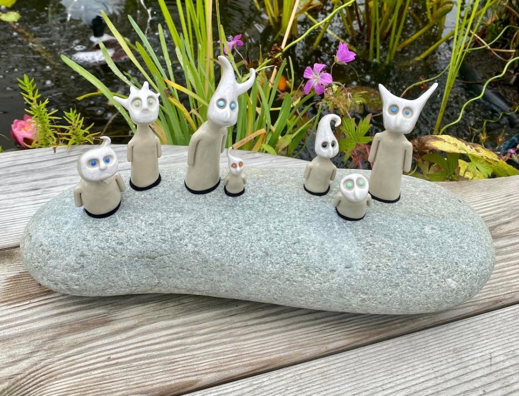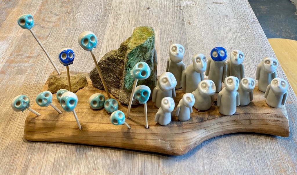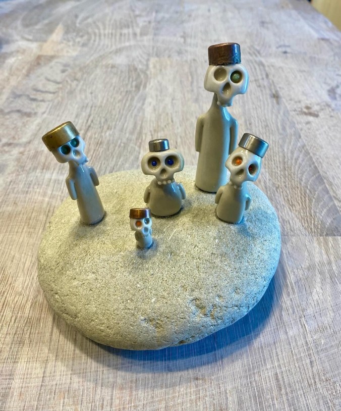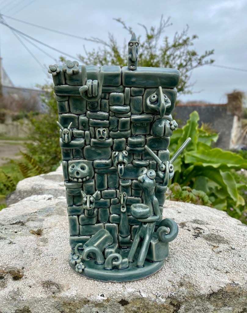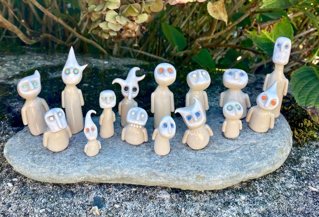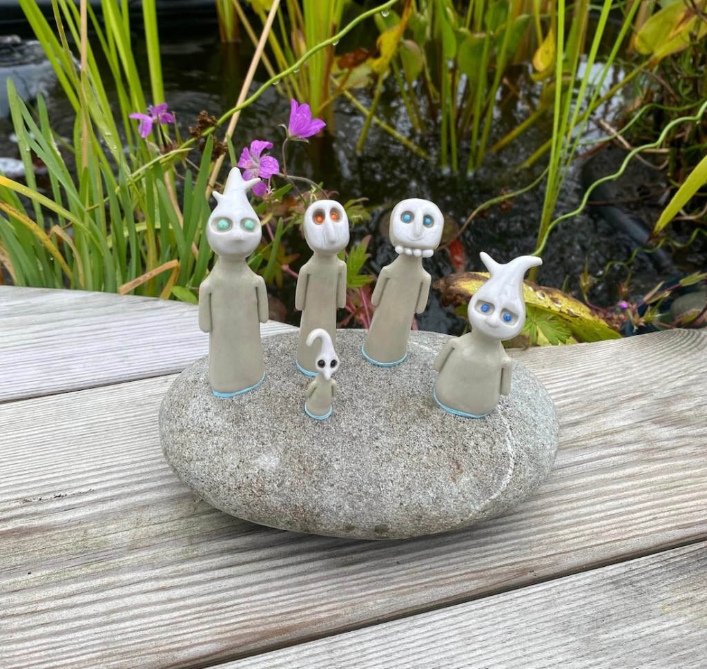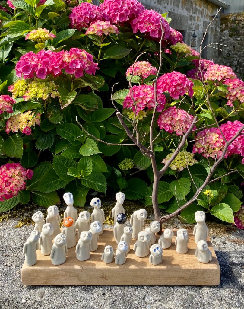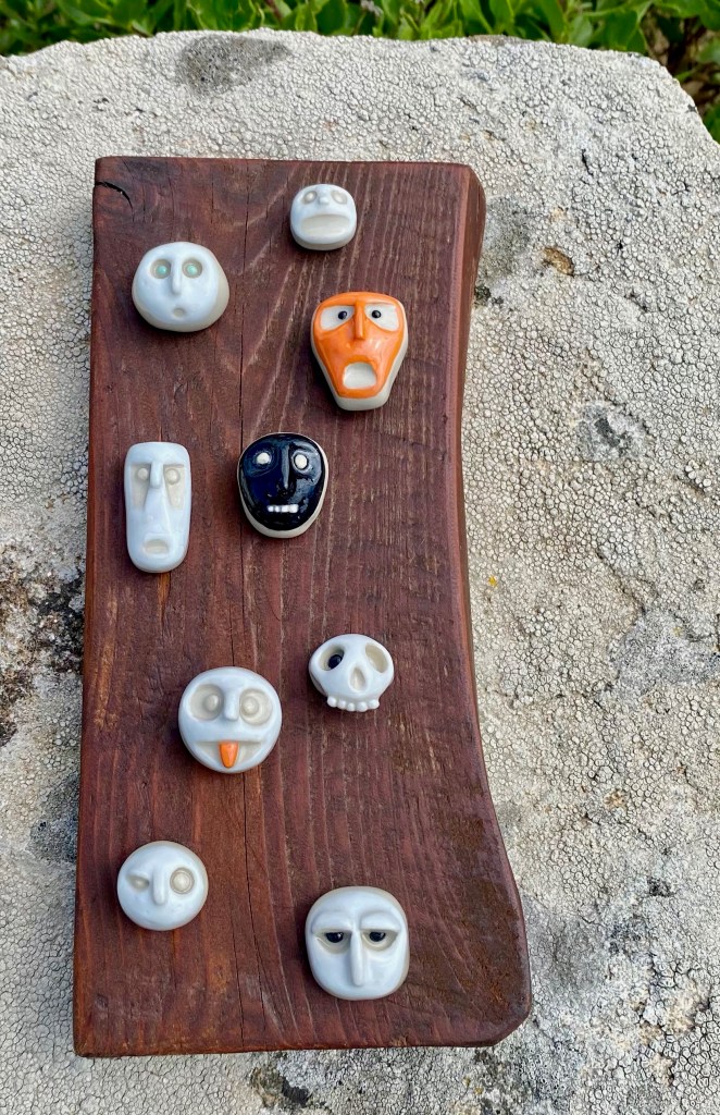 Ensuite les créations de 2022, avec pour nouveautés : l’utilisation du Vert Mousse, du Noir Ardoise, du Sable, quelques essais en porcelaine, des bijoux, des totems de têtes et des assemblées de bonzommes sur galet !