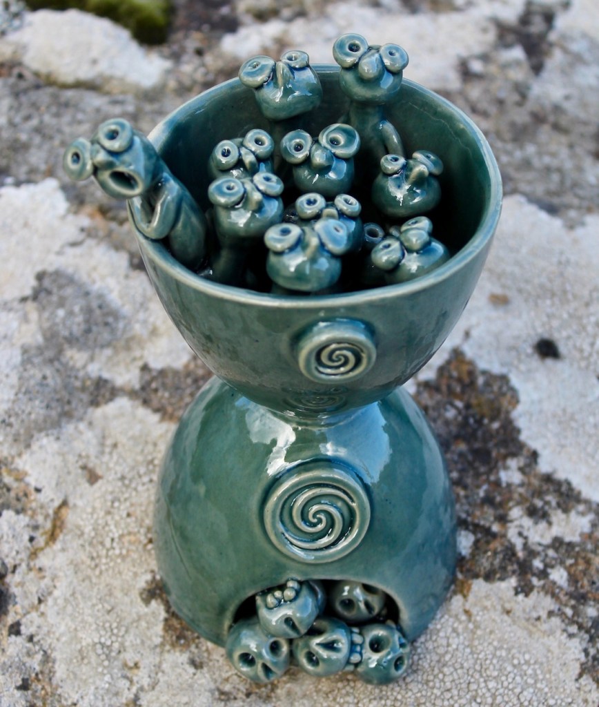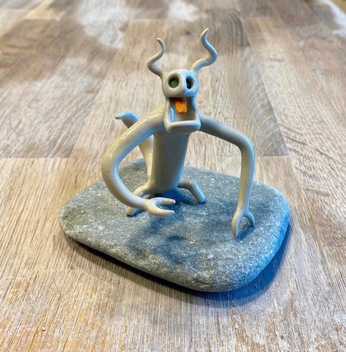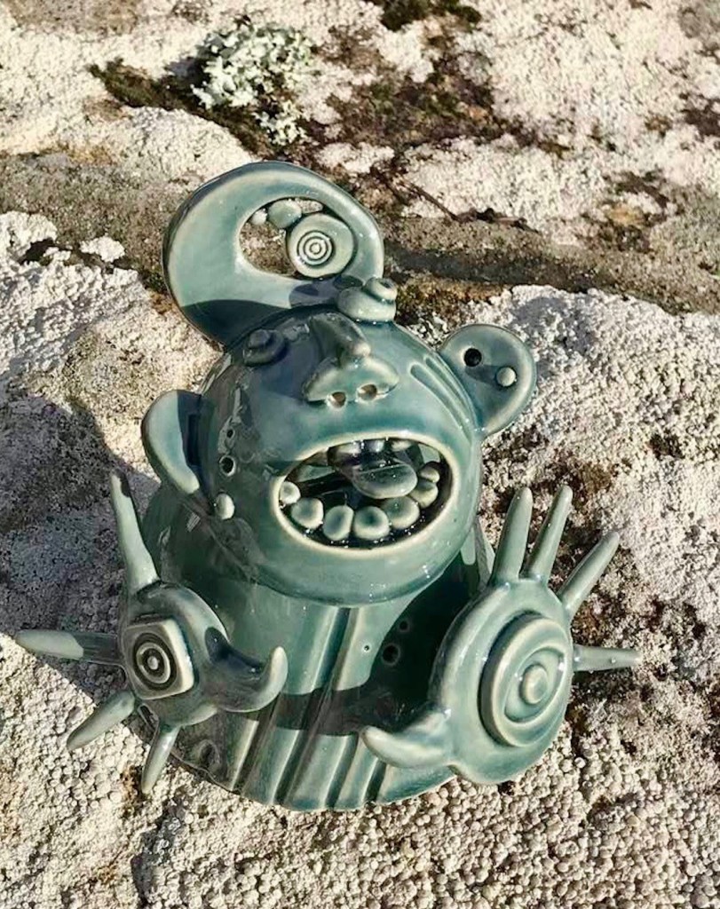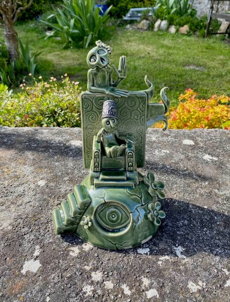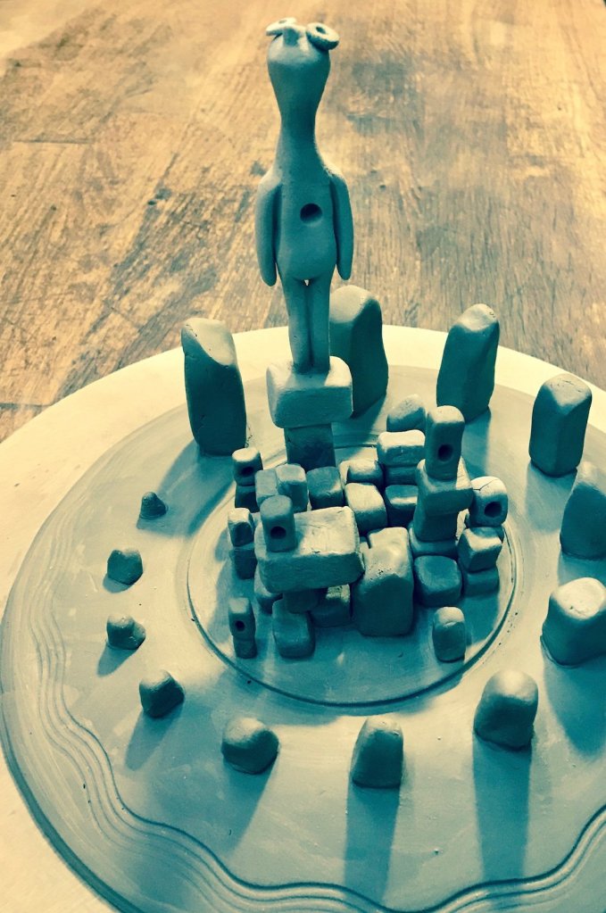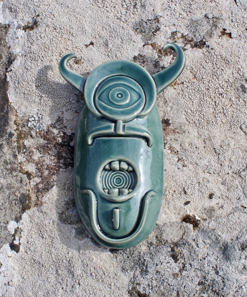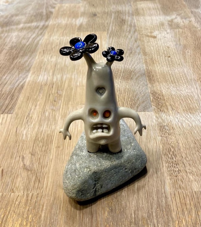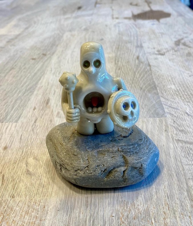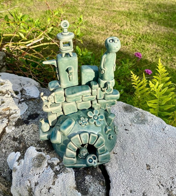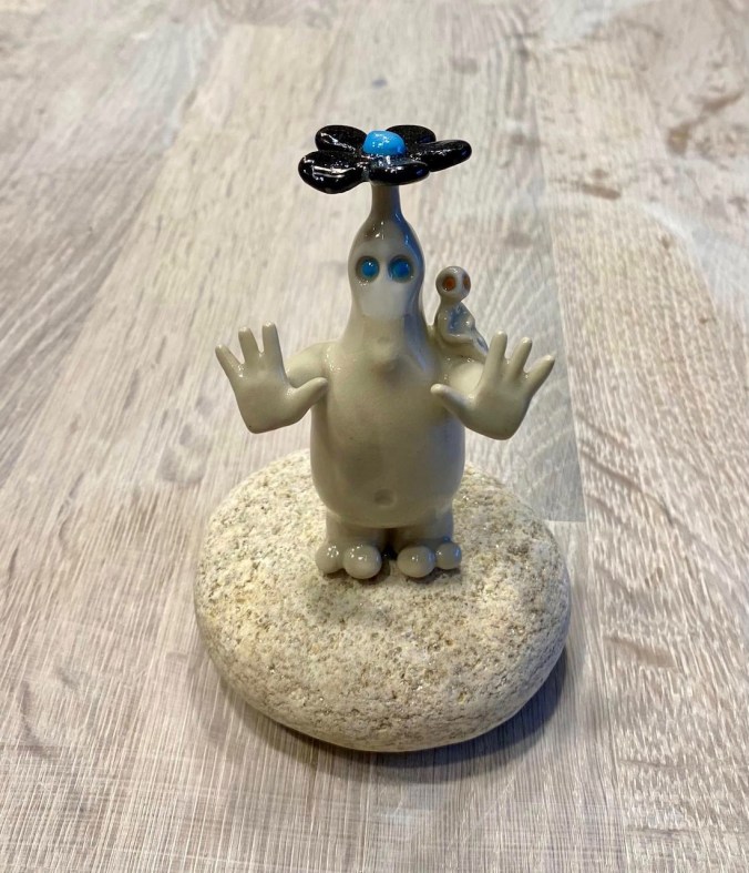 Ensuite les créations de 2022, avec pour nouveautés : l’utilisation du Vert Mousse, du Noir Ardoise, du Sable, quelques essais en porcelaine, des bijoux, des totems de têtes et des assemblées de bonzommes sur galet !