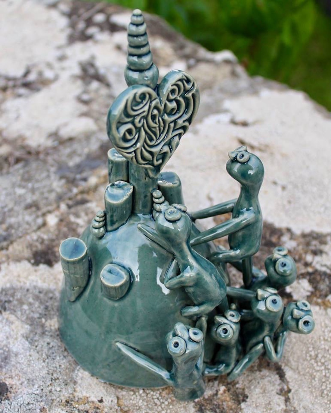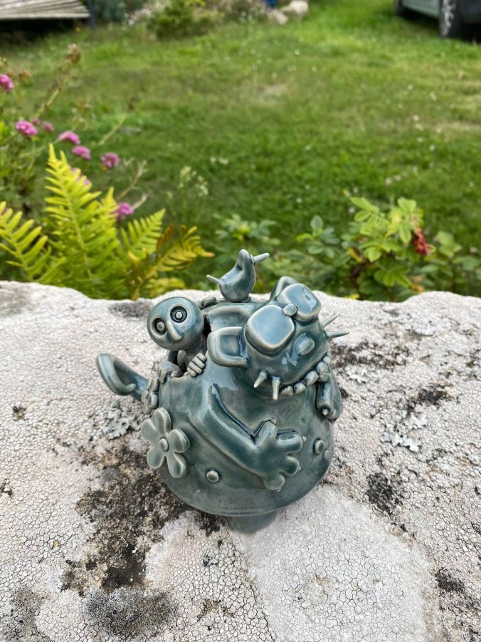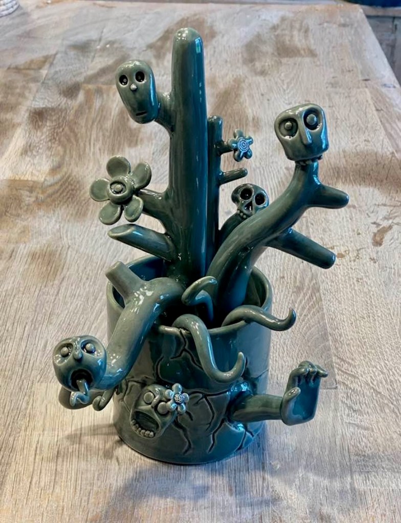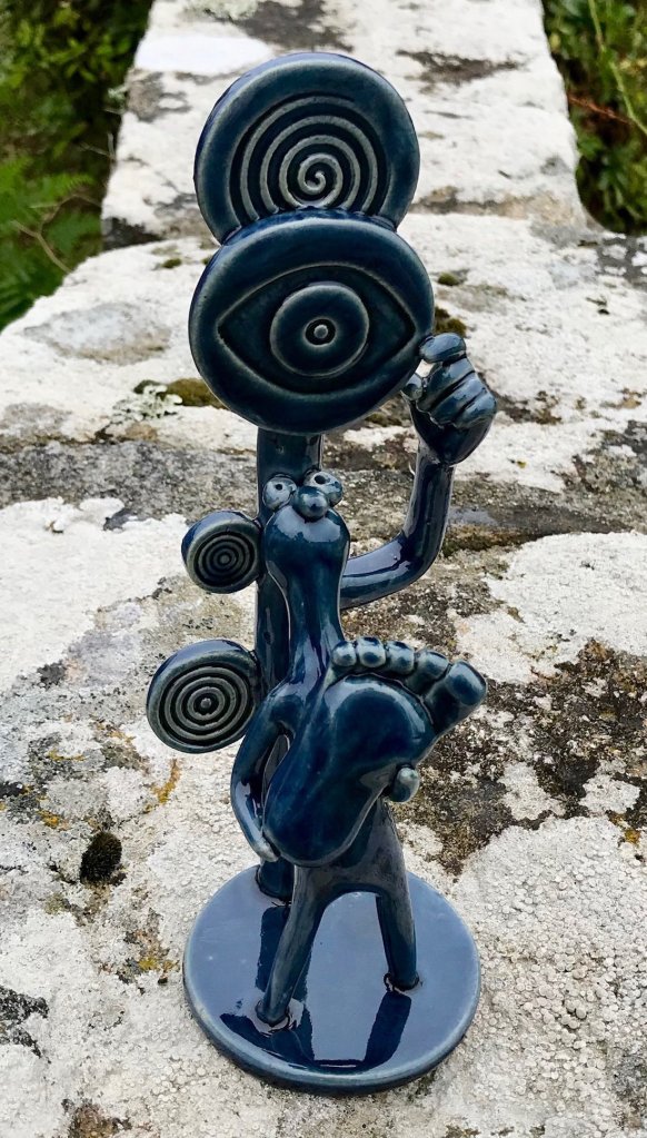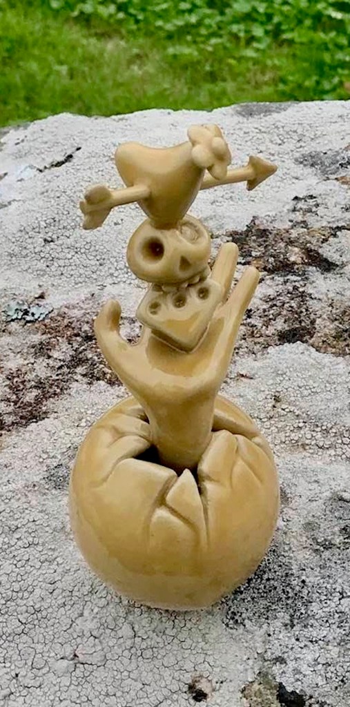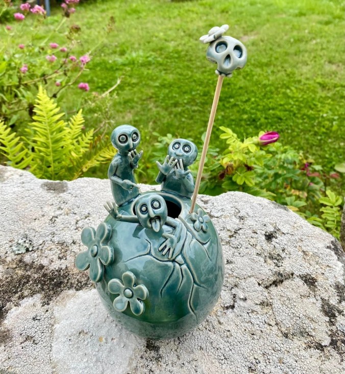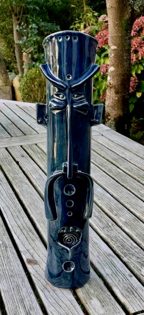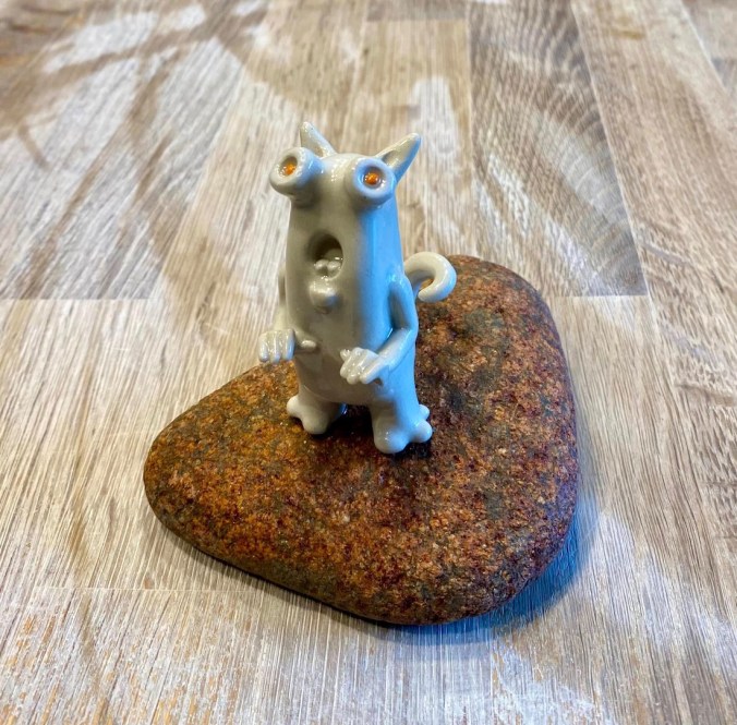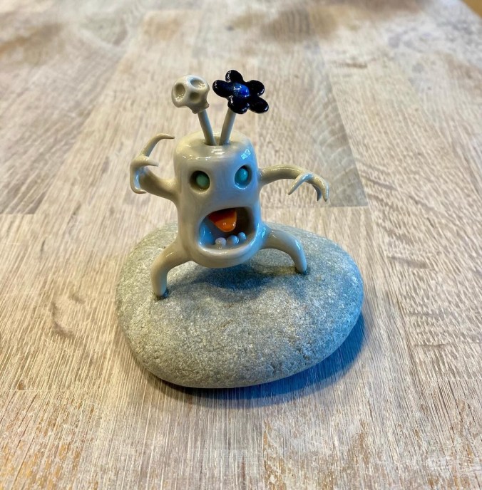 Ensuite les créations de 2022, avec pour nouveautés : l’utilisation du Vert Mousse, du Noir Ardoise, du Sable, quelques essais en porcelaine, des bijoux, des totems de têtes et des assemblées de bonzommes sur galet !