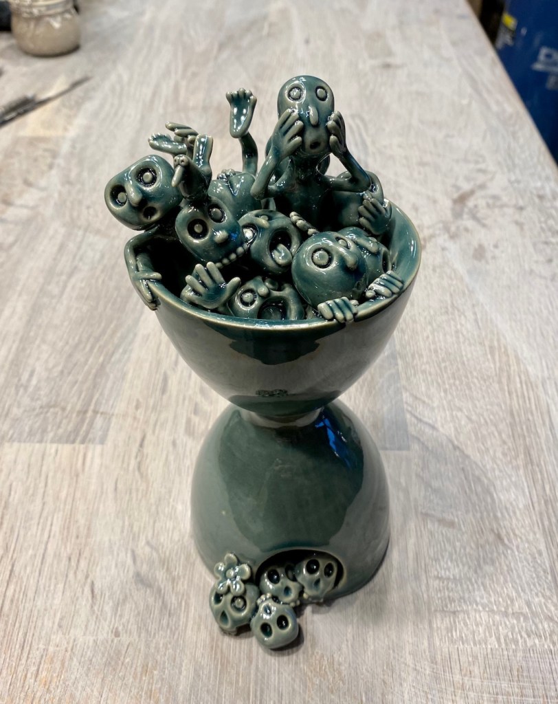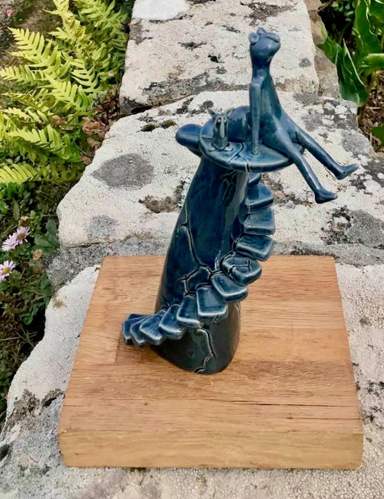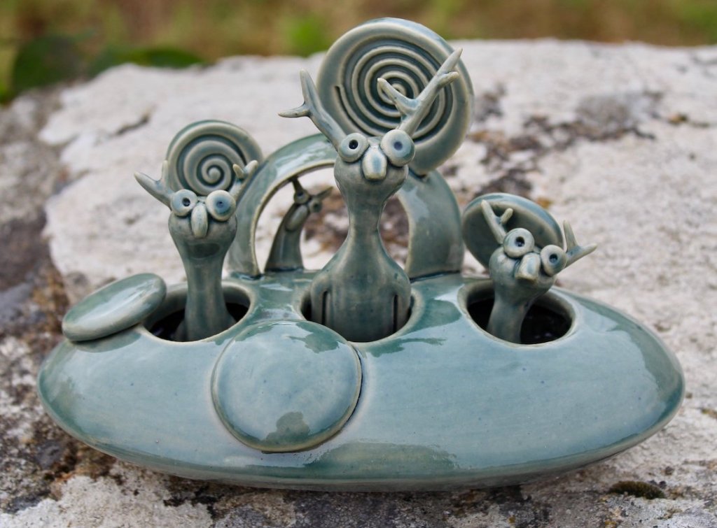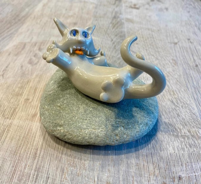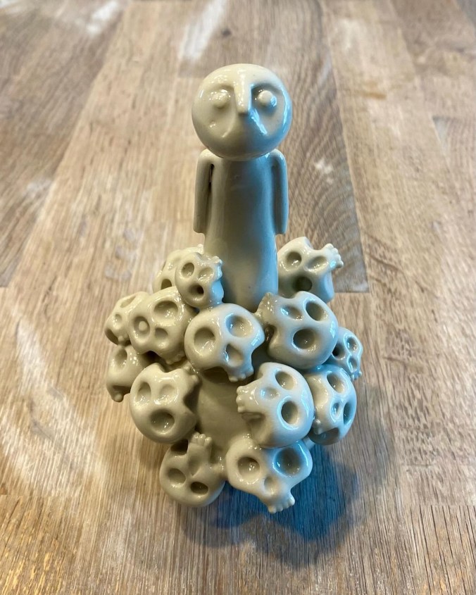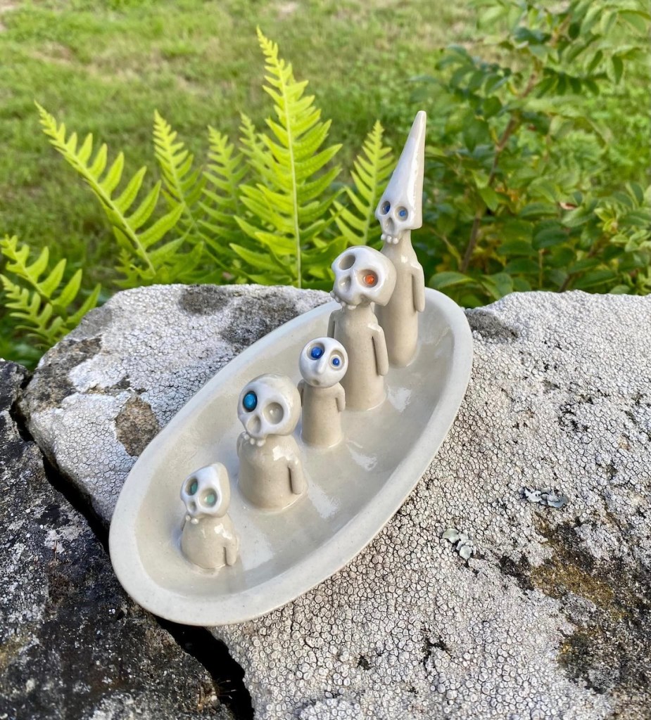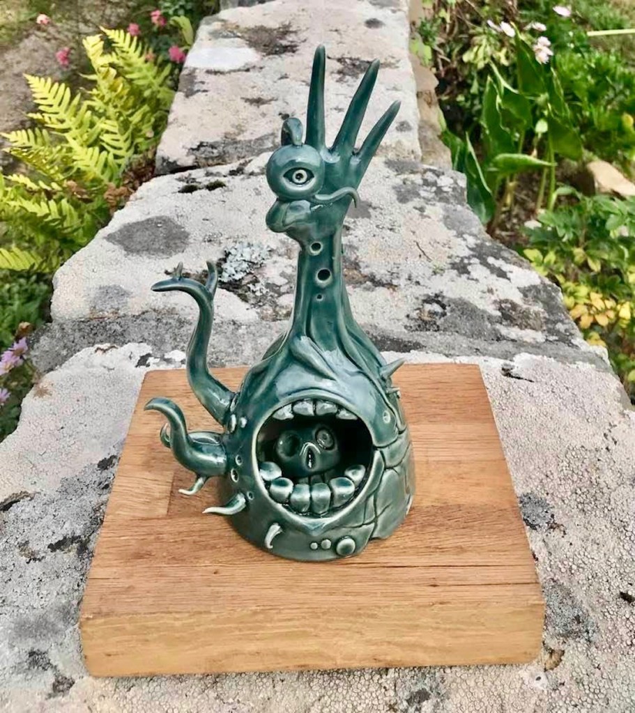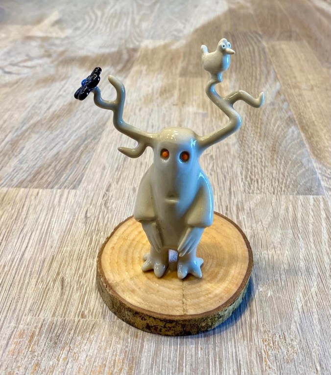Ensuite les créations de 2022, avec pour nouveautés : l’utilisation du Vert Mousse, du Noir Ardoise, du Sable, quelques essais en porcelaine, des bijoux, des totems de têtes et des assemblées de bonzommes sur galet !