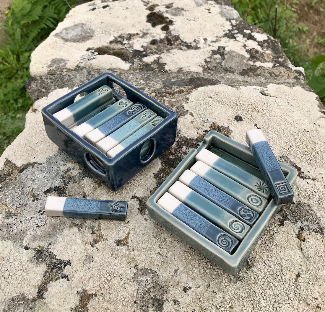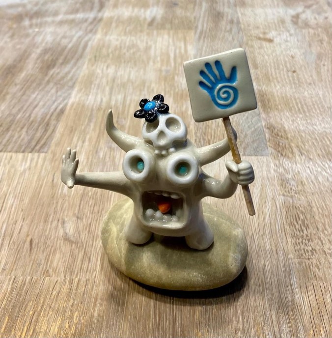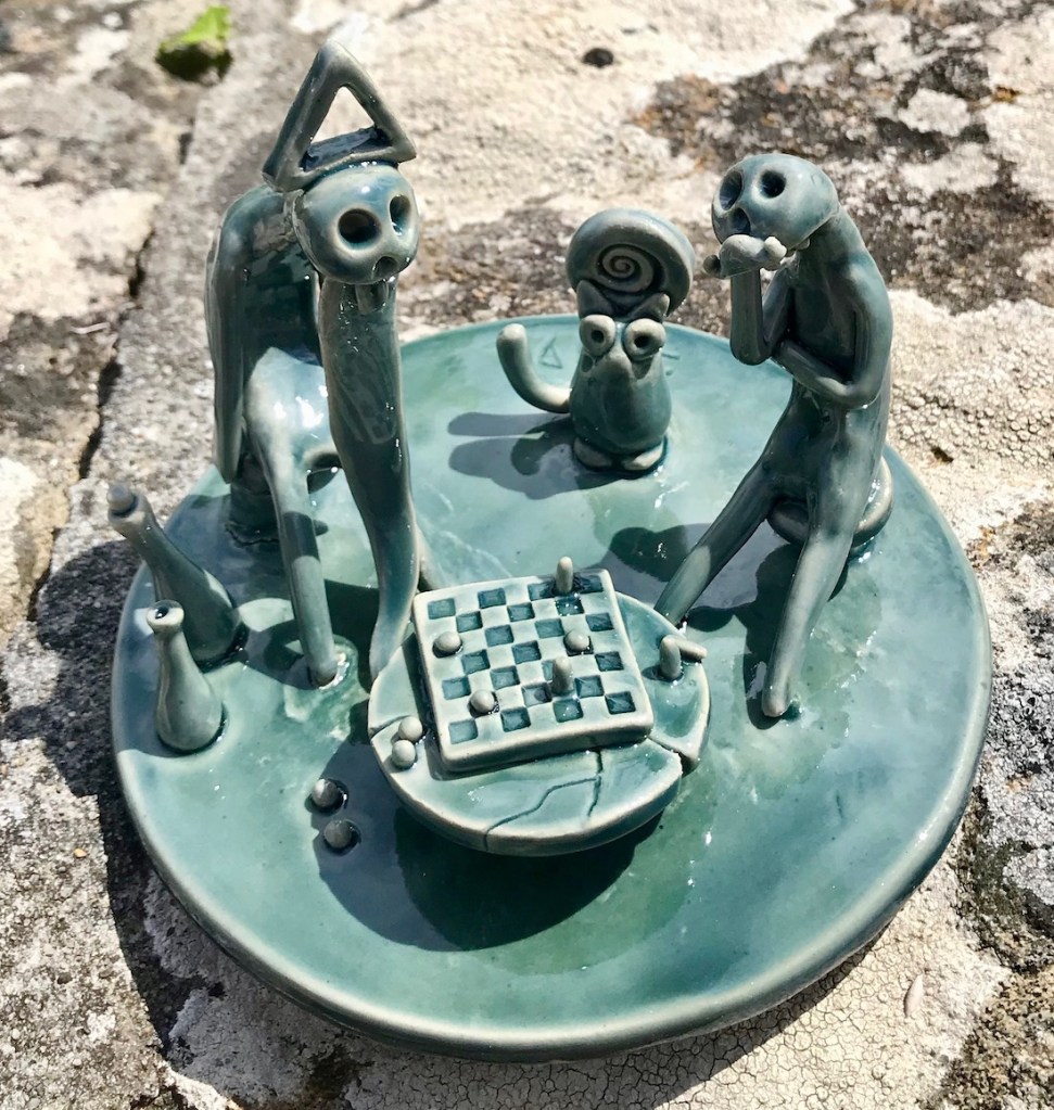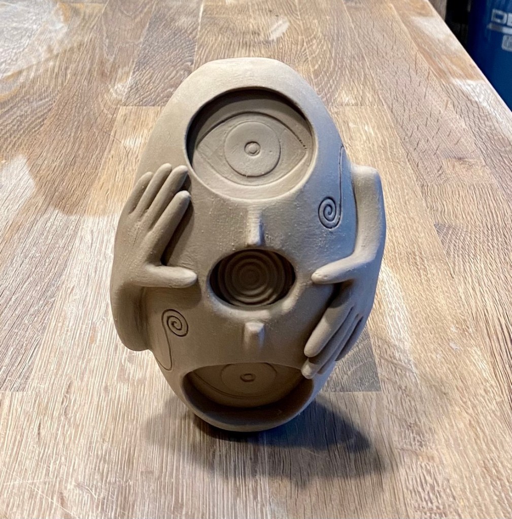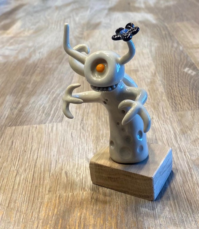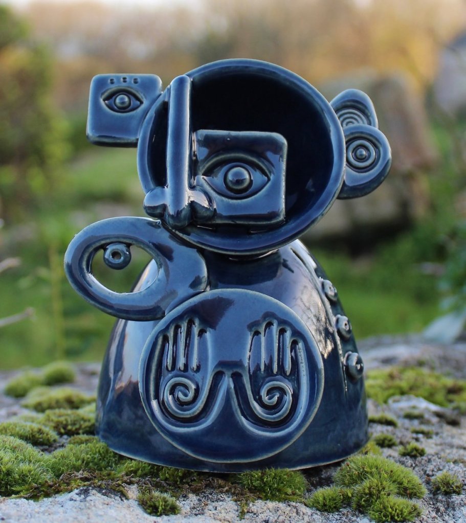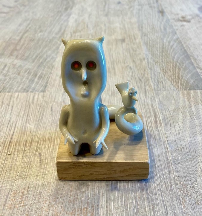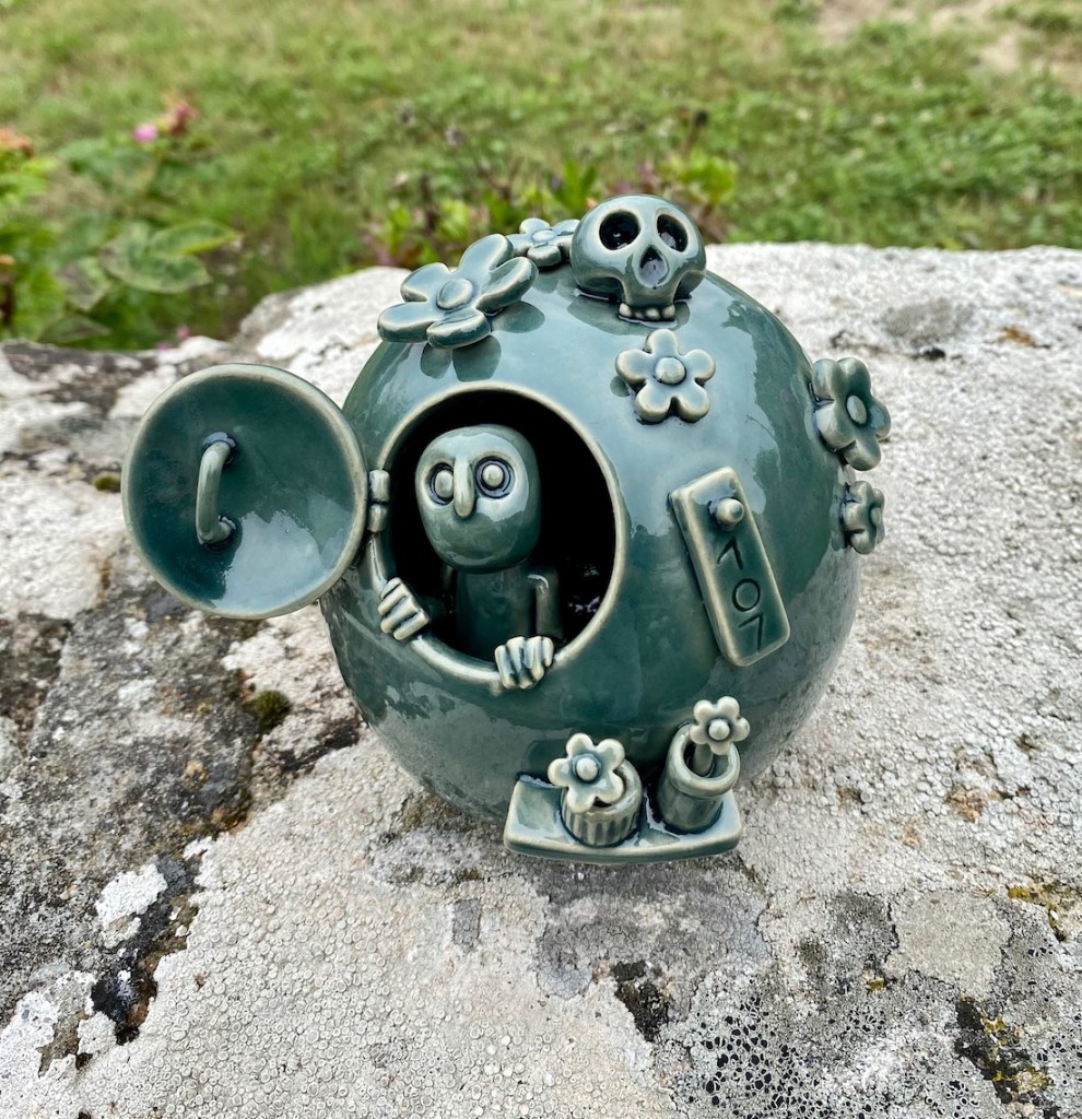Ensuite les créations de 2022, avec pour nouveautés : l’utilisation du Vert Mousse, du Noir Ardoise, du Sable, quelques essais en porcelaine, des bijoux, des totems de têtes et des assemblées de bonzommes sur galet !