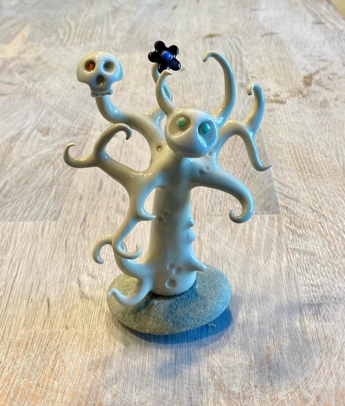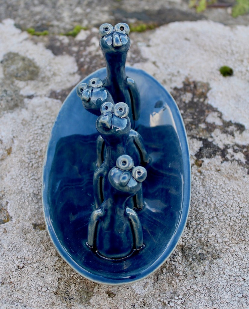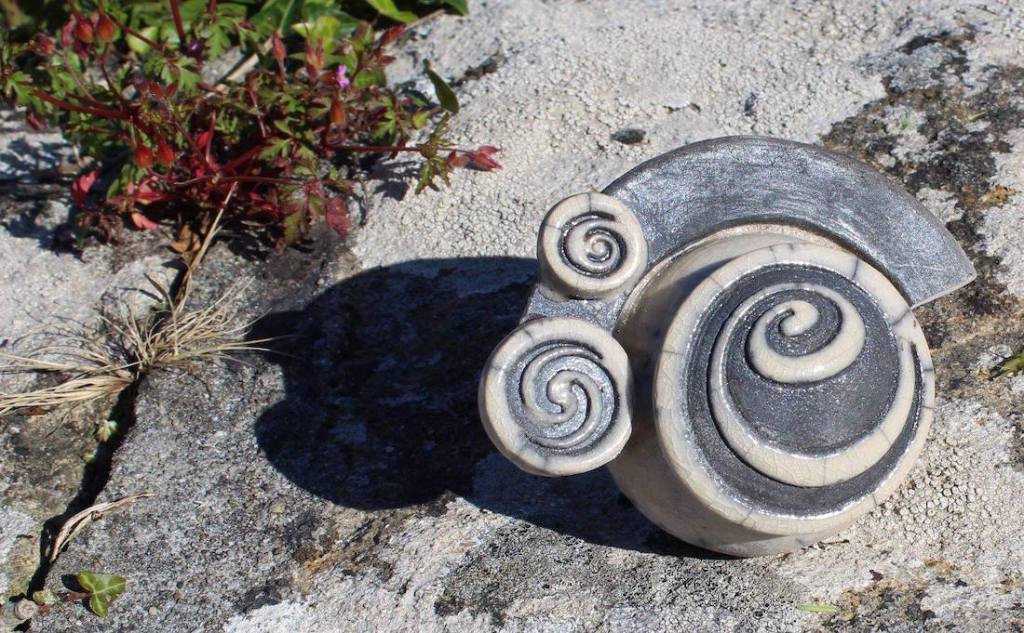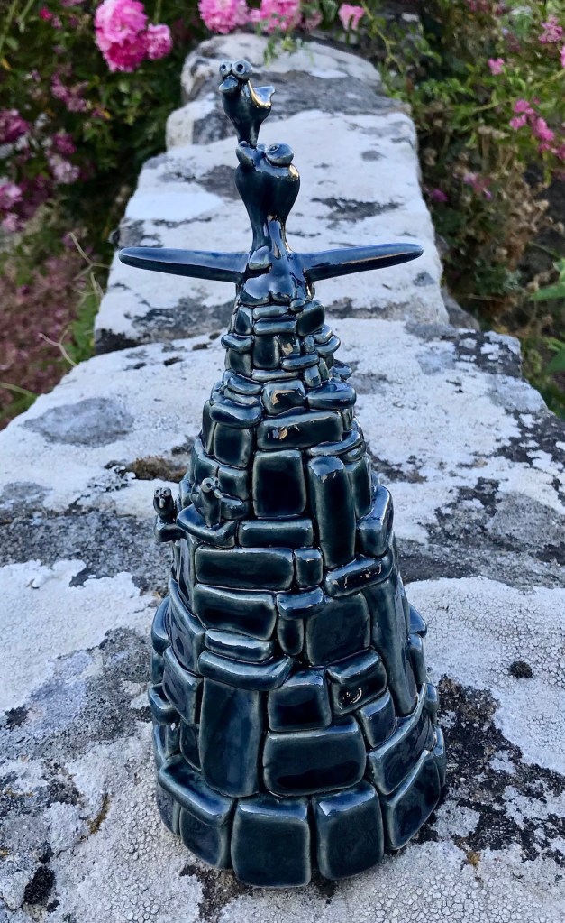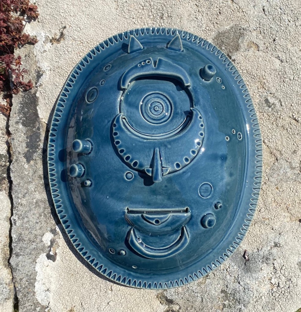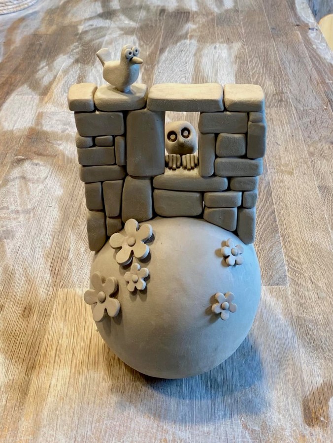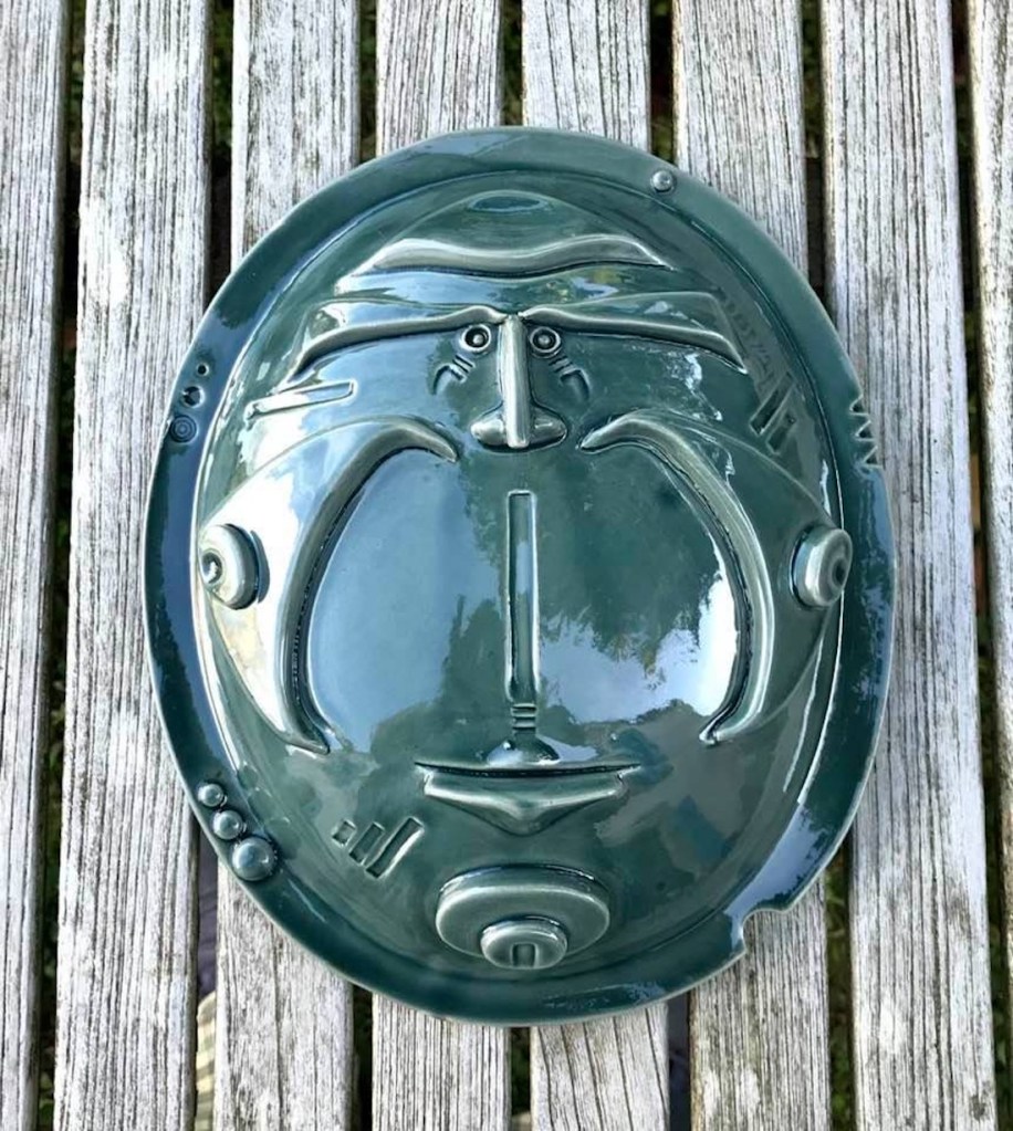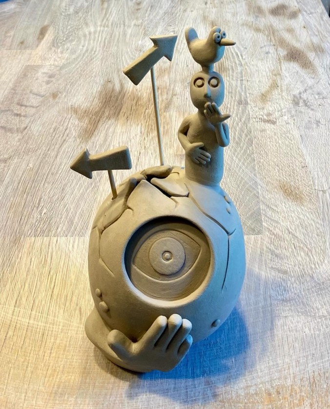 Ensuite les créations de 2022, avec pour nouveautés : l’utilisation du Vert Mousse, du Noir Ardoise, du Sable, quelques essais en porcelaine, des bijoux, des totems de têtes et des assemblées de bonzommes sur galet !