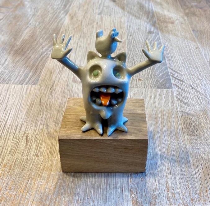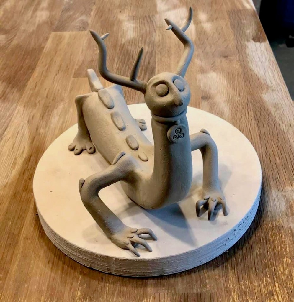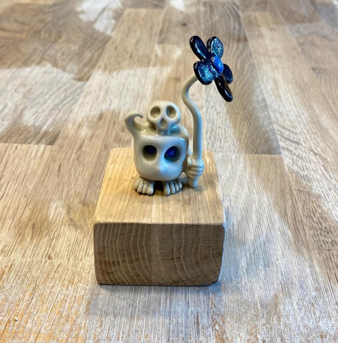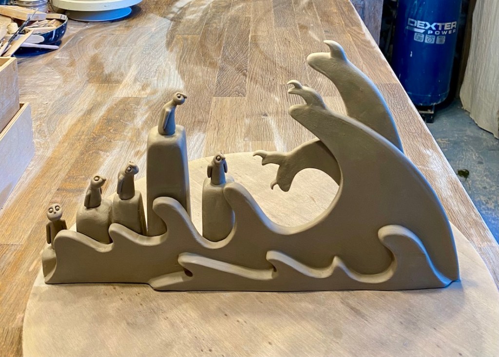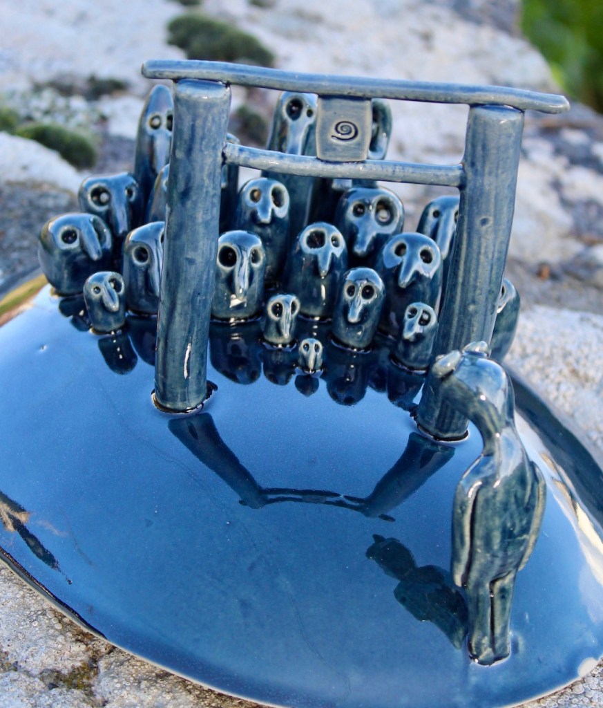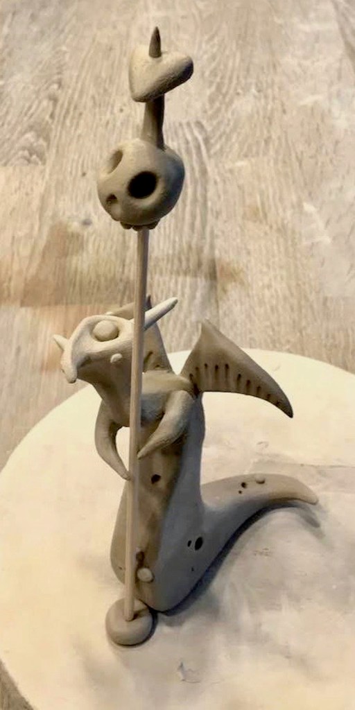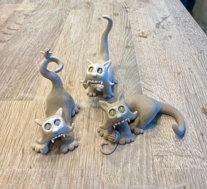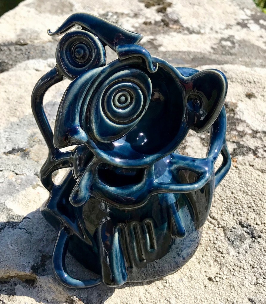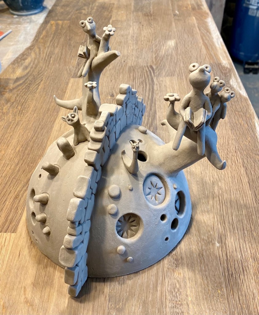 Ensuite les créations de 2022, avec pour nouveautés : l’utilisation du Vert Mousse, du Noir Ardoise, du Sable, quelques essais en porcelaine, des bijoux, des totems de têtes et des assemblées de bonzommes sur galet !