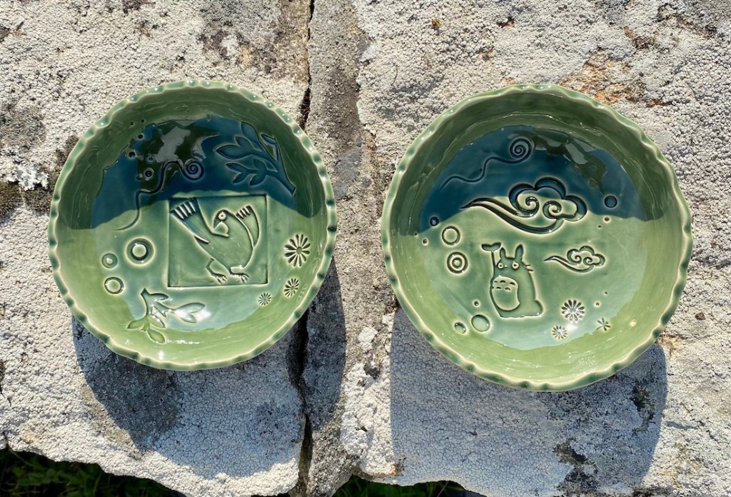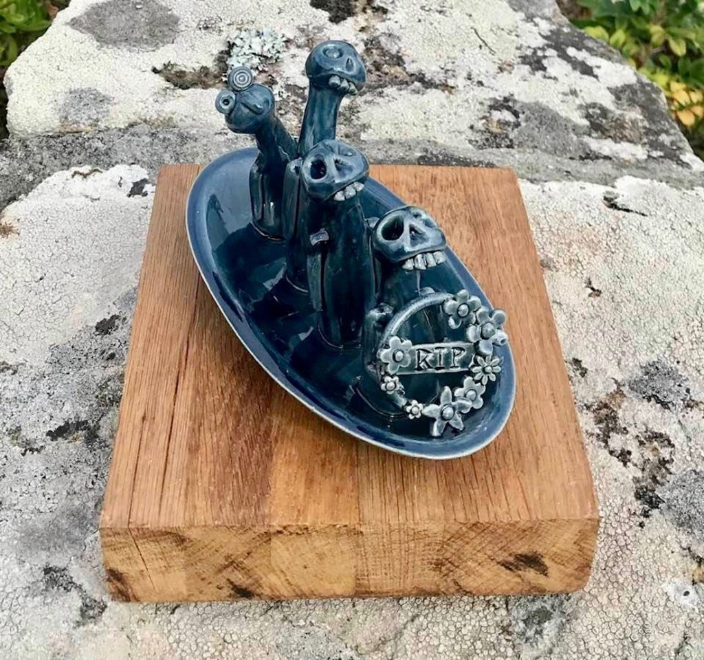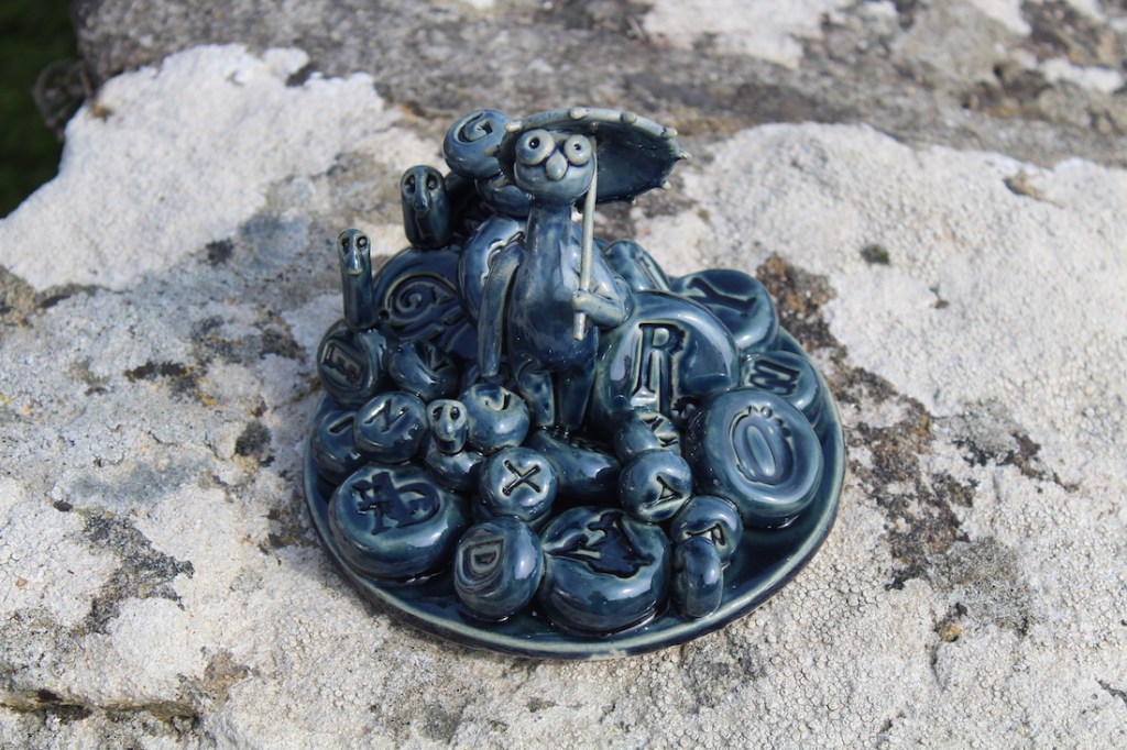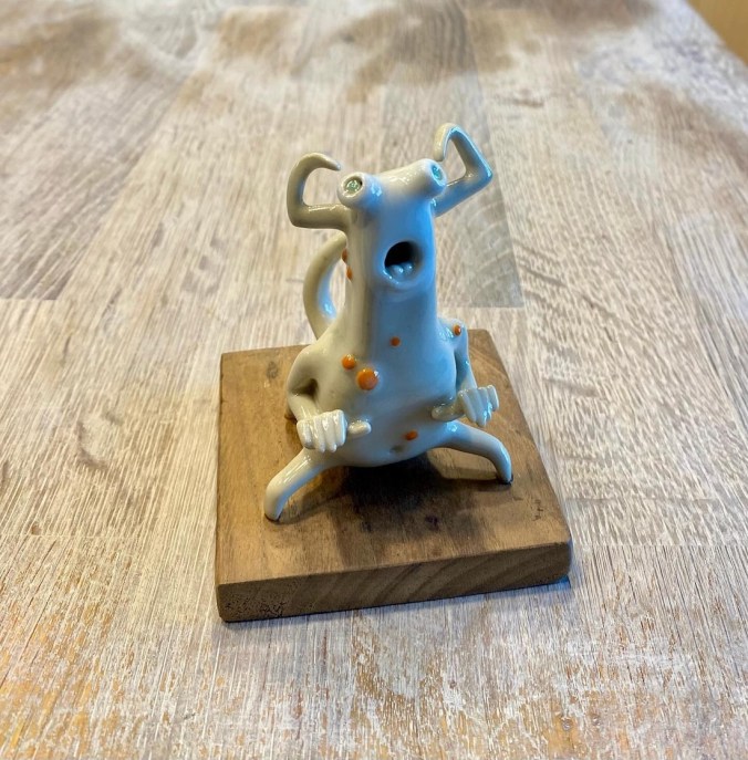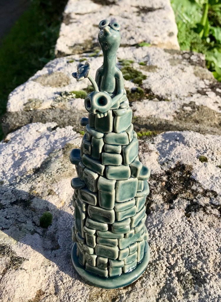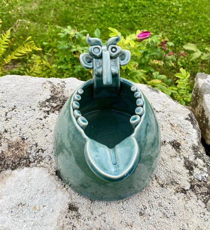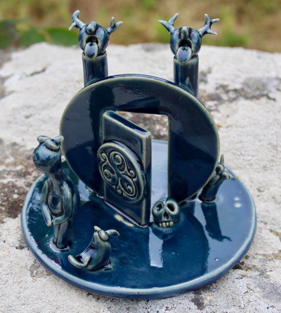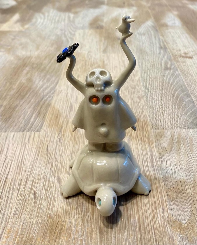 Ensuite les créations de 2022, avec pour nouveautés : l’utilisation du Vert Mousse, du Noir Ardoise, du Sable, quelques essais en porcelaine, des bijoux, des totems de têtes et des assemblées de bonzommes sur galet !