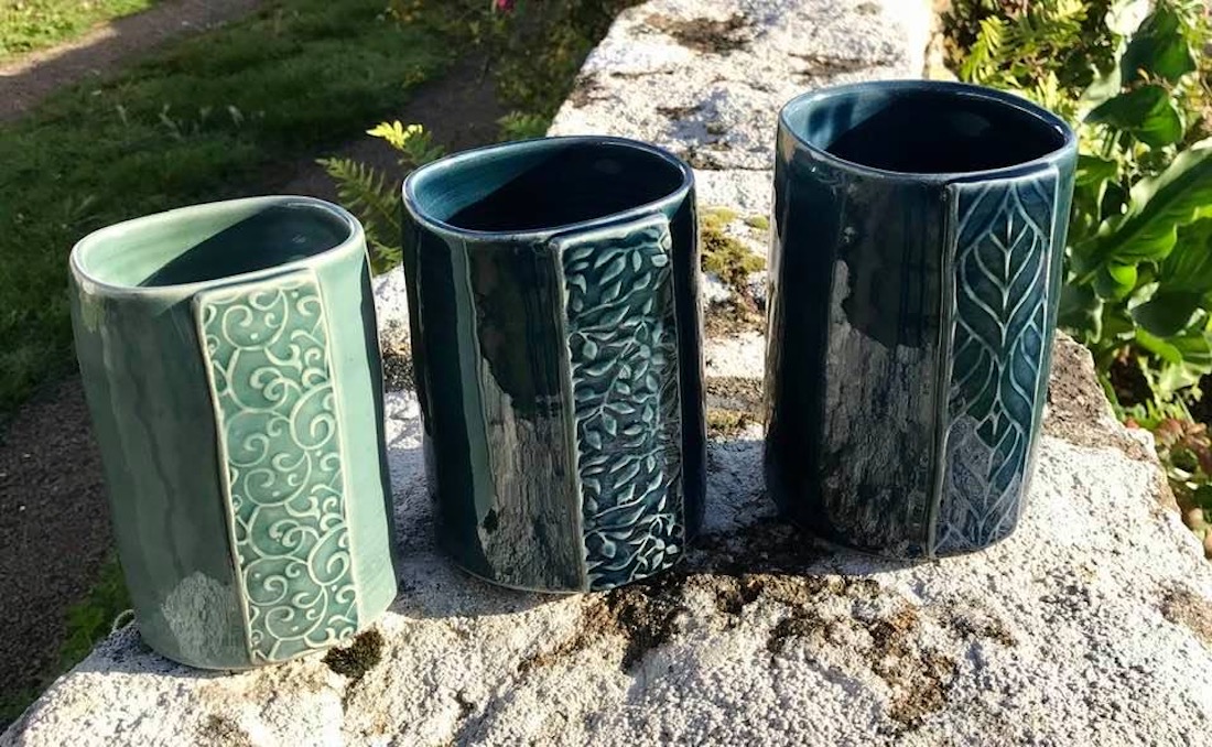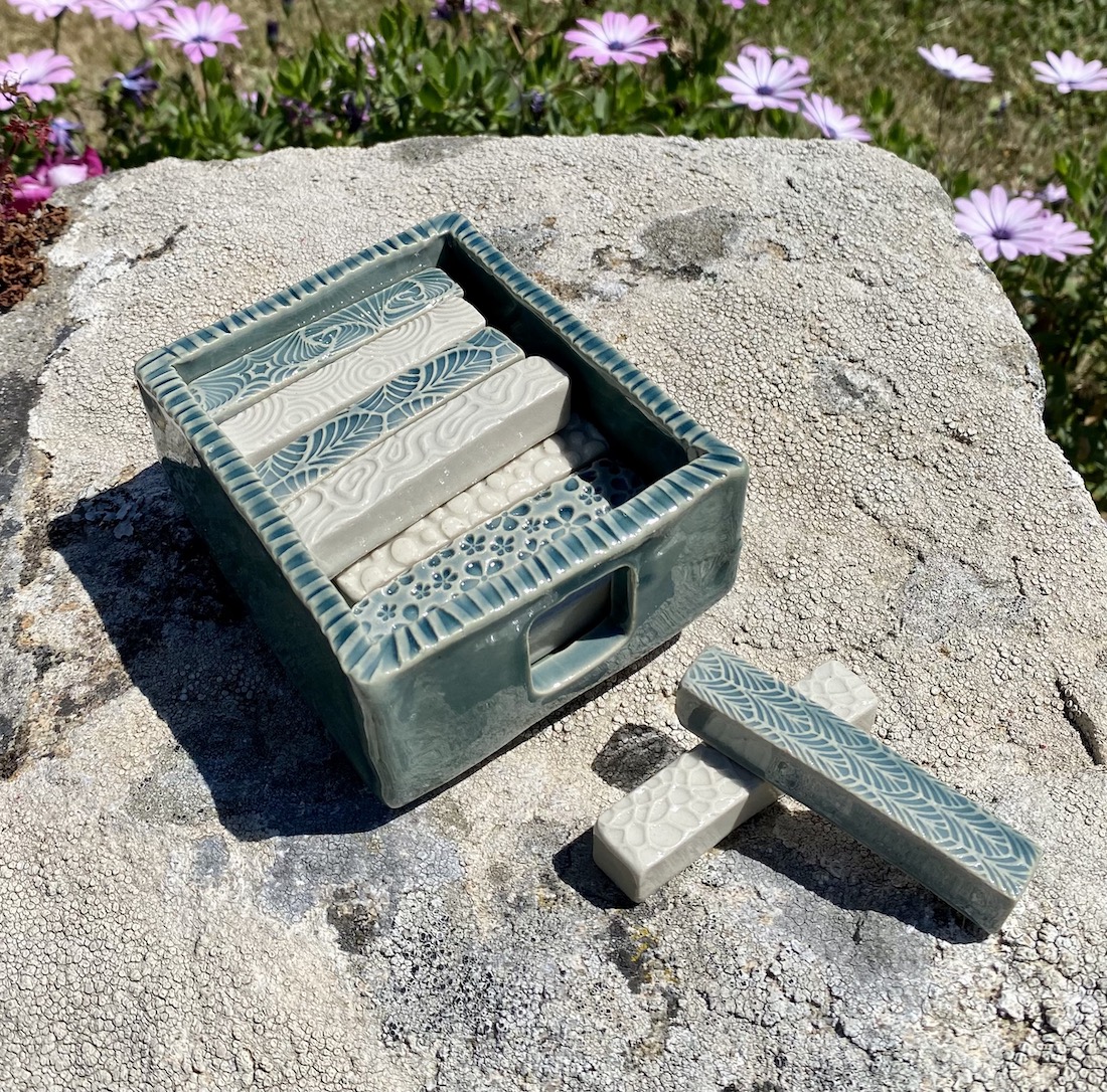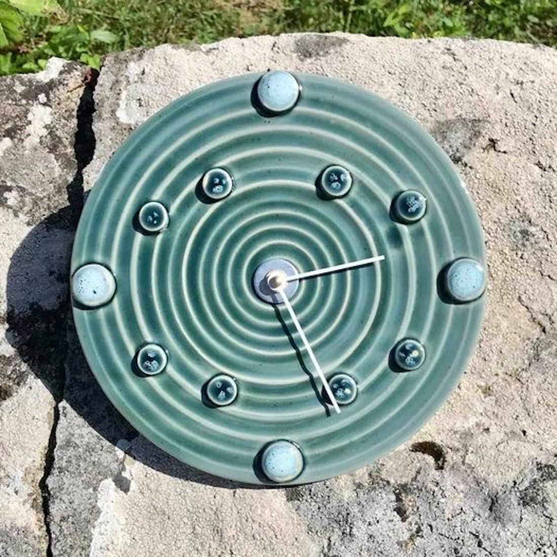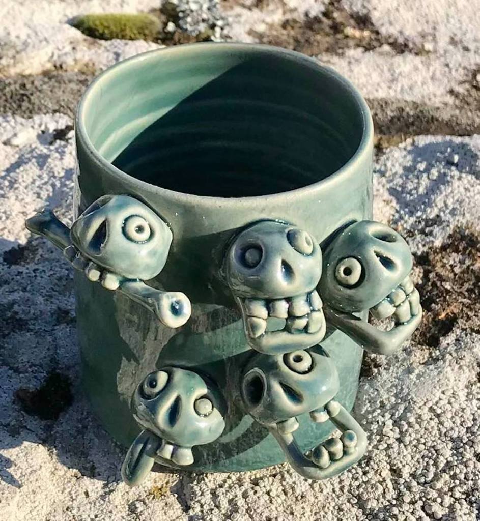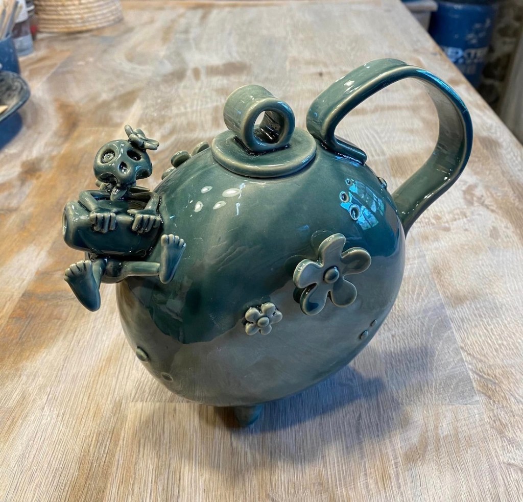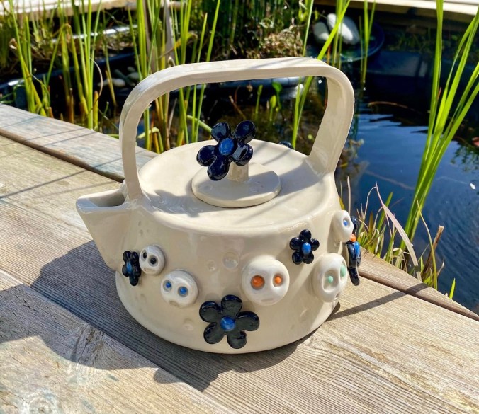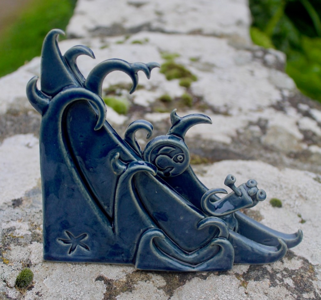 Ensuite les créations de 2022, avec pour nouveautés : l’utilisation du Vert Mousse, du Noir Ardoise, du Sable, quelques essais en porcelaine, des bijoux, des totems de têtes et des assemblées de bonzommes sur galet !