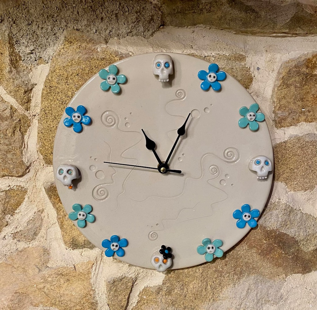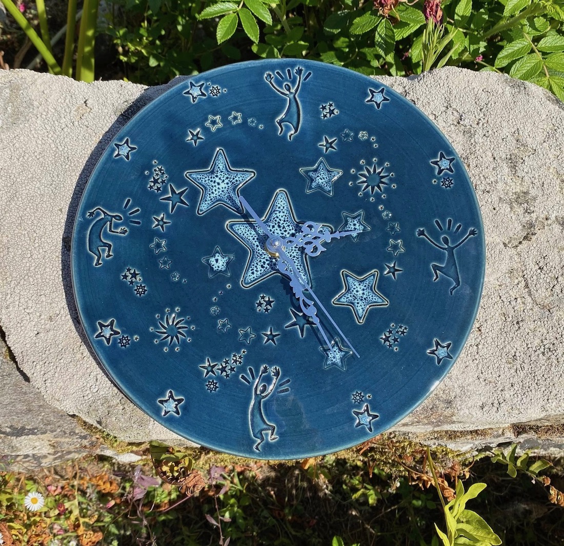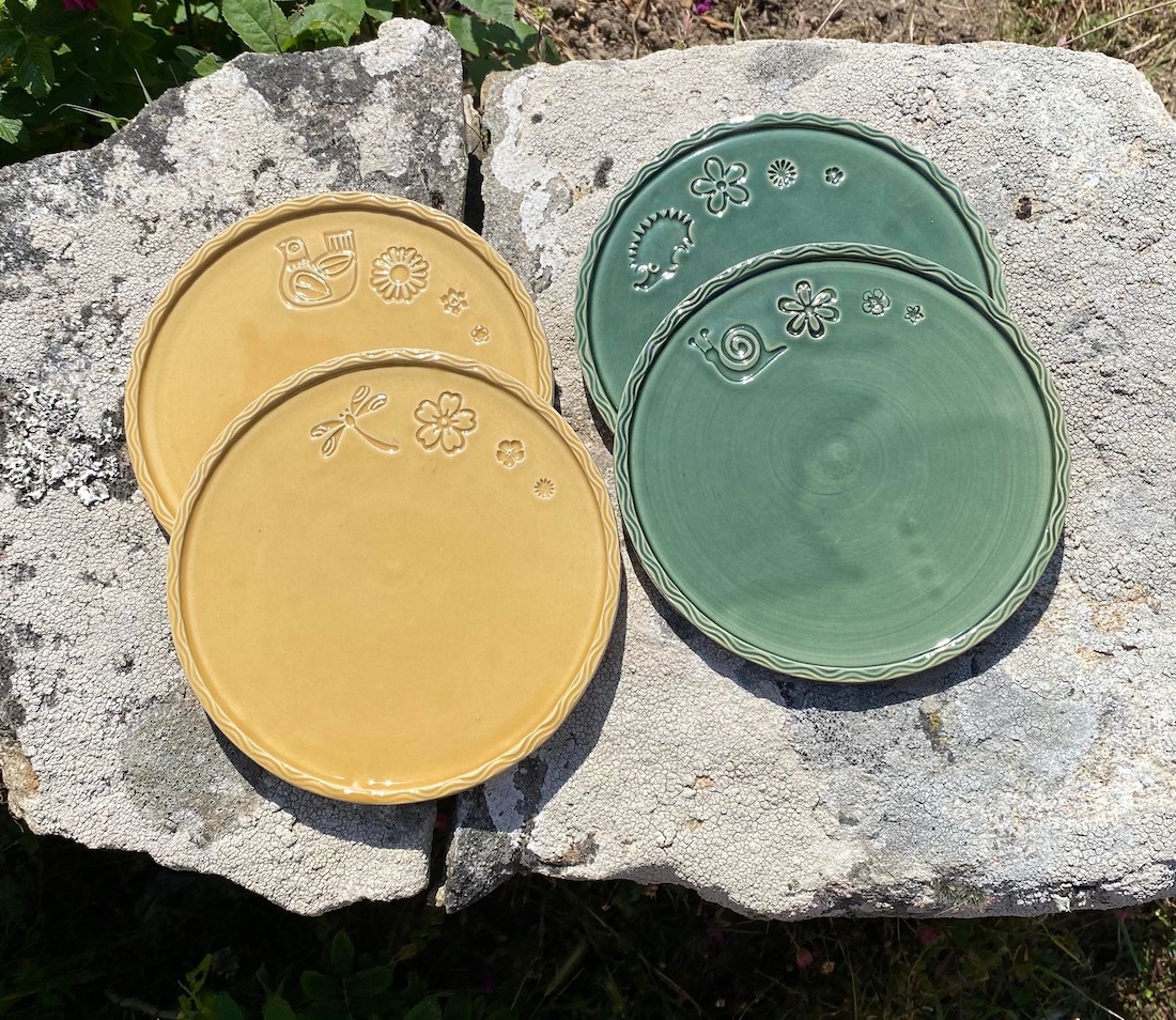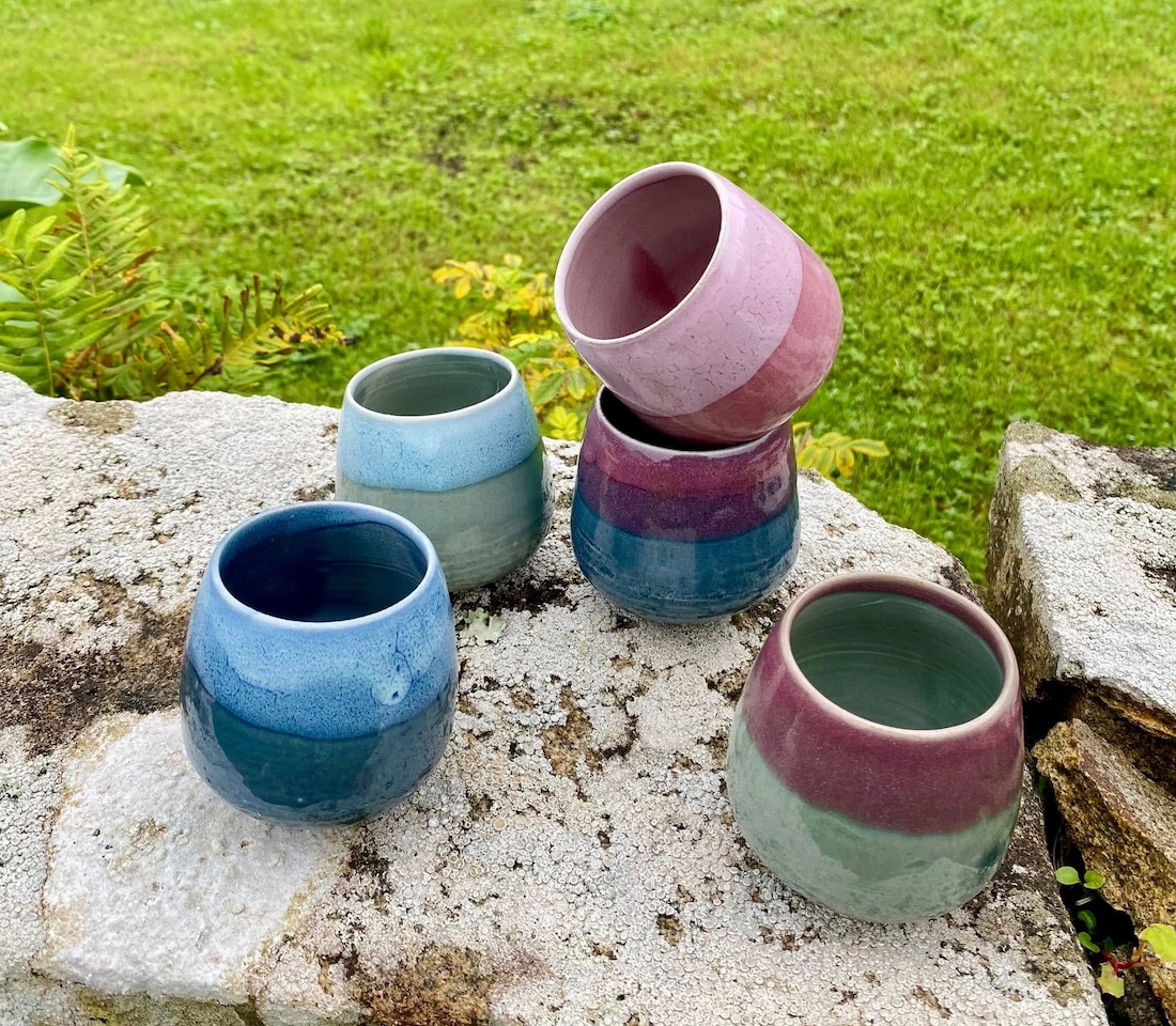 Ensuite les créations de 2022, avec pour nouveautés : l’utilisation du Vert Mousse, du Noir Ardoise, du Sable, quelques essais en porcelaine, des bijoux, des totems de têtes et des assemblées de bonzommes sur galet !